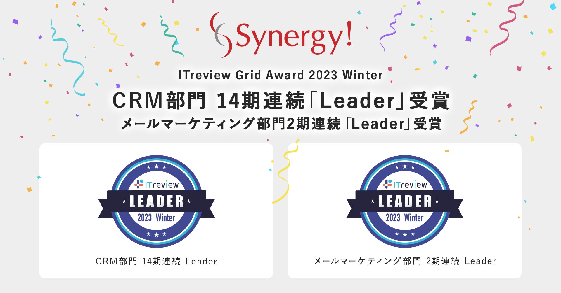「Synergy!」が「ITreview Grid Award 2023 Winter」 CRMとメールマーケティング部門で最高位「Leader」受賞、CRM部門は14期連続「Leader」受賞