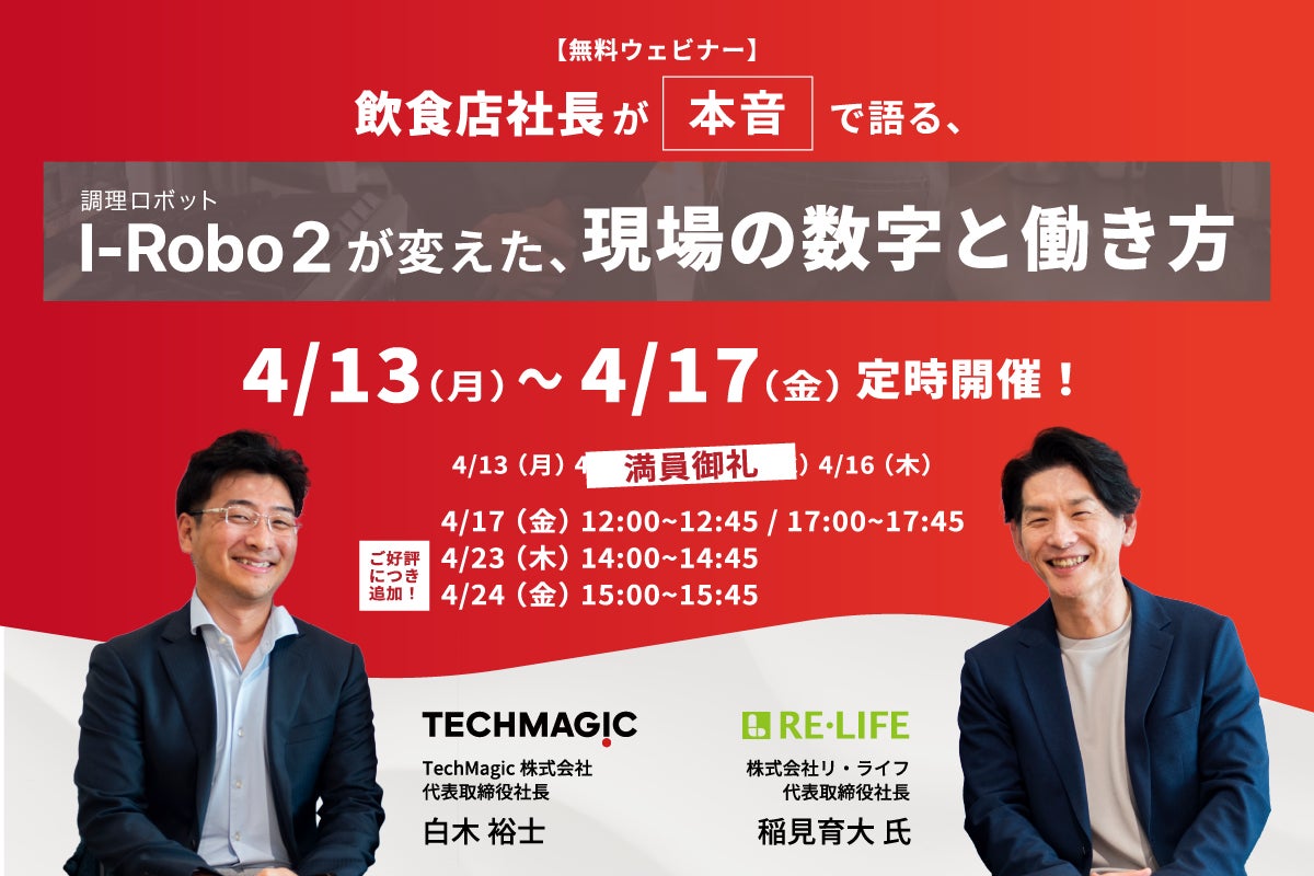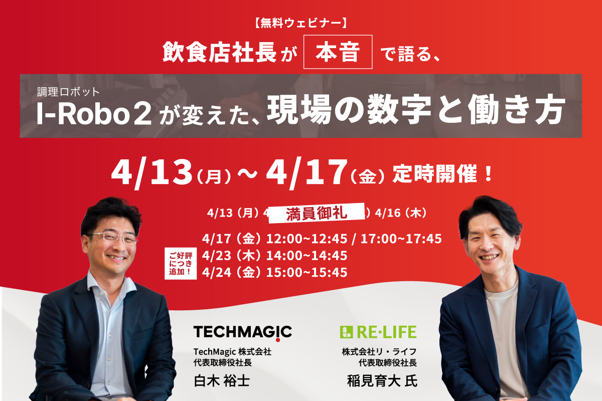 この度、炒め調理ロボット「I-Robo 2」を実際に導入された株式会社リ・ライフ代表取締役社長・稲見育大氏をゲストにお迎えし、導入前後の定量・定性効果をリアルな現場の声とともにお伝えするウェビナーを開催いたします。人手不足や味の標準化、多店舗展開といった外食業界共通の課題に向き合うすべての経営者・オーナー様にぜひご参加いただきたい内容です。