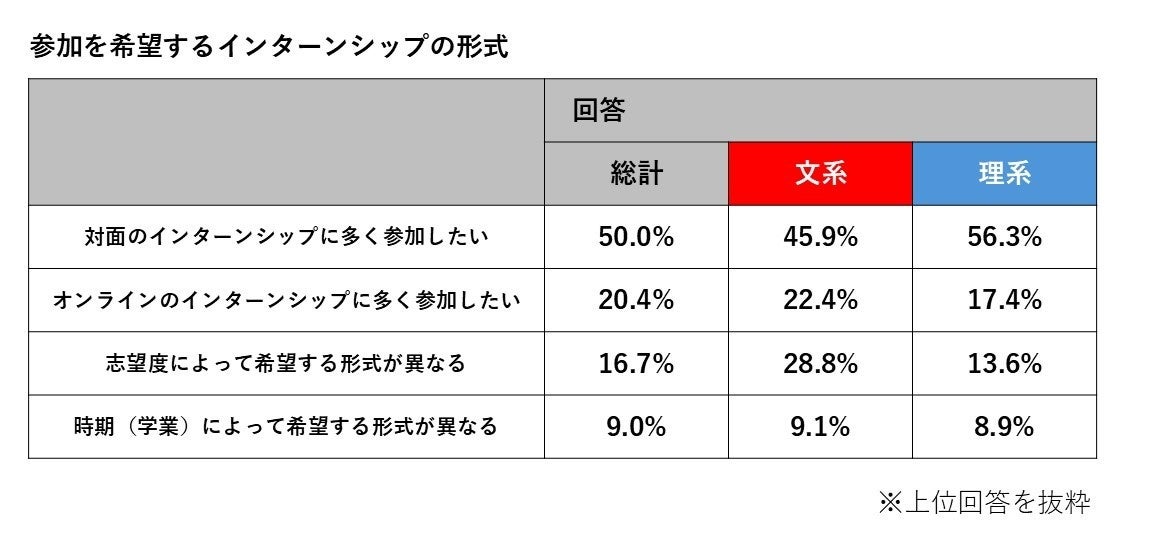 参加を希望するインターンの形式については、「対面のインターンシップに多く参加したい」が最も多く、その割合は50%に達しました。