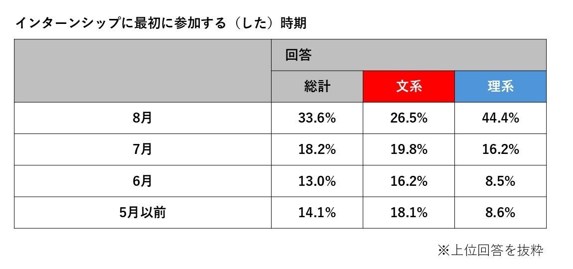 文理別に見ると、文系では「5月以前」と回答した人が約20%おり、年々早期化傾向が強まっていることが分かります。一方、理系では約45%が「8月」と回答しており、大学が夏休みの期間にインターンシップに参加する学生が多いことが分かりました。