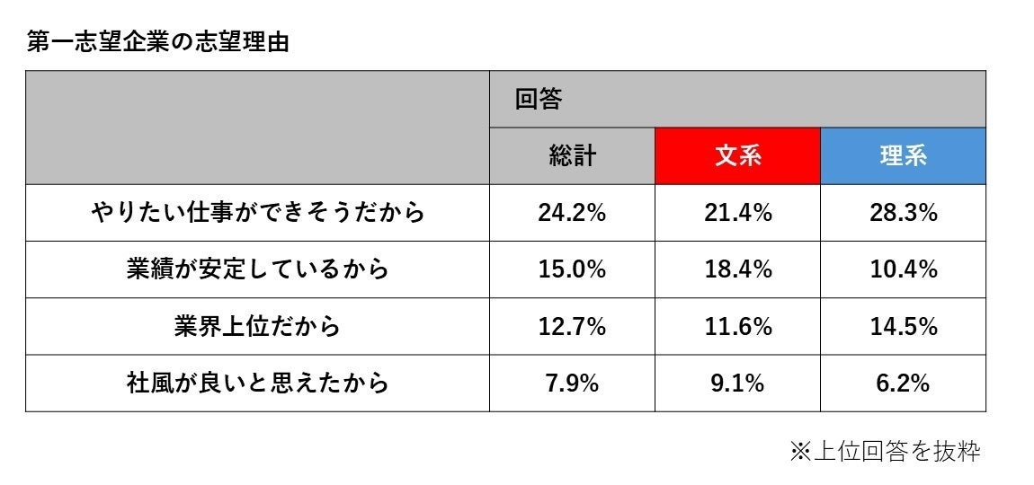 第一志望理由は「やりたい仕事ができそうだから」が1位。ジョブ志向がより顕著に