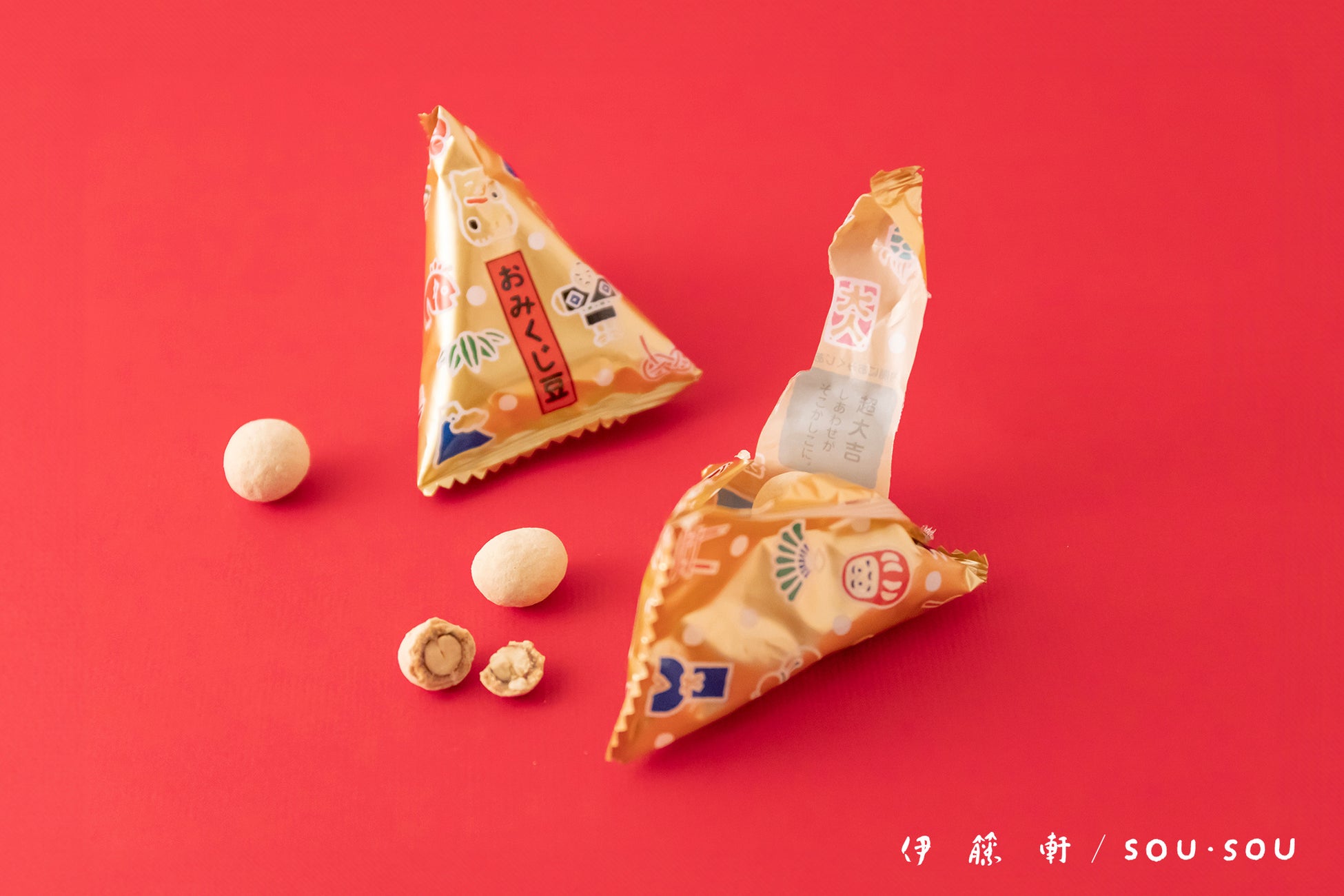 京都のブランド「SOU・SOU」のポップなテキスタイルデザインが、京菓子の老舗「伊藤軒」のお菓子になりました。おいしくて、かわいくて 、どこかなつかしい「わらべ菓子」シリーズの新作は「おみくじ豆」。生地でくるんだ落花生を煎り、きな粉をかけて仕上げた、ほんのり香ばしいお菓子です。個包装のテトラパック内側におみくじがついているので、年末年始の家族や友人との集まりの場に賑わいをもたらしてくれる手土産として最適。同時に、SOU・SOU スタッフが小さなこけしに描かれた「SOU 装あられ」とのボックスセットや、「わらべ菓子」の定番人気商品「羊羹カステイラ」も、楽しくラインナップ。なお、おみくじ豆のオリジナルボックス入りはネットショップのみ。実店舗ではSOU・SOU おくりもの』『SOU・SOU KYOTO 青山店』『伊藤軒 / SOU・SOU 清水店』『伊藤軒 / SOU・SOU JR 京都伊勢丹店』で「袋入りタイプ」をお取り扱いしています。