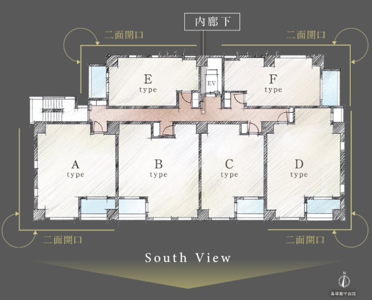 敷地の南側が、高層建物の少ない住宅地に面する見晴らしの良さを活かし、南向きの全ての住戸に南面バルコニーを備えました。他の住戸は、二面開口の通風採光に優れた角住戸とするなど、明るさと開放感がある住空間を計画しました。上層階からは、池袋方面のビル群を望む開放的な眺望を楽しめます。また、内廊下を中心としたフロアレイアウトとすることで、快適性を高めるとともに、プライバシーやセキュリティにも配慮しました。