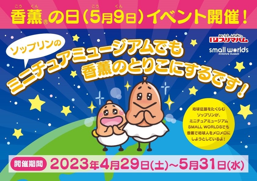 アジア最大級の「ミニチュアミュージアム スモールワールズ 」(以下、スモワル)は、オフィシャルパートナーであるプリマハム株式会社様(以下、プリマハム)とのコラボにより、2023年4月29日~5月31日の期間、香薫の日イベントを開催します。プリマハムのキャラクター「あらびき星人ソップリン(以下、ソップリン)」がミニチュアミュージアムのお客様も香薫のとりこにします。3月25日にリニューアルしたスモールワールズで、たくさんの発見が思い出につながるイベントをお楽しみください!