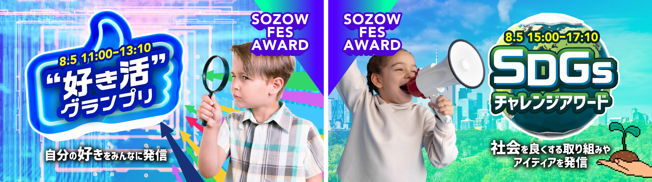「SOZOW FES AWARD」は、自分が熱中していること、好きなことを発信する「好き活グランプリ」と、世界・社会をより良くする取り組みやアイデアを発信する「SDGsチャレンジ・アワード」の2部門に分かれて開催されます。