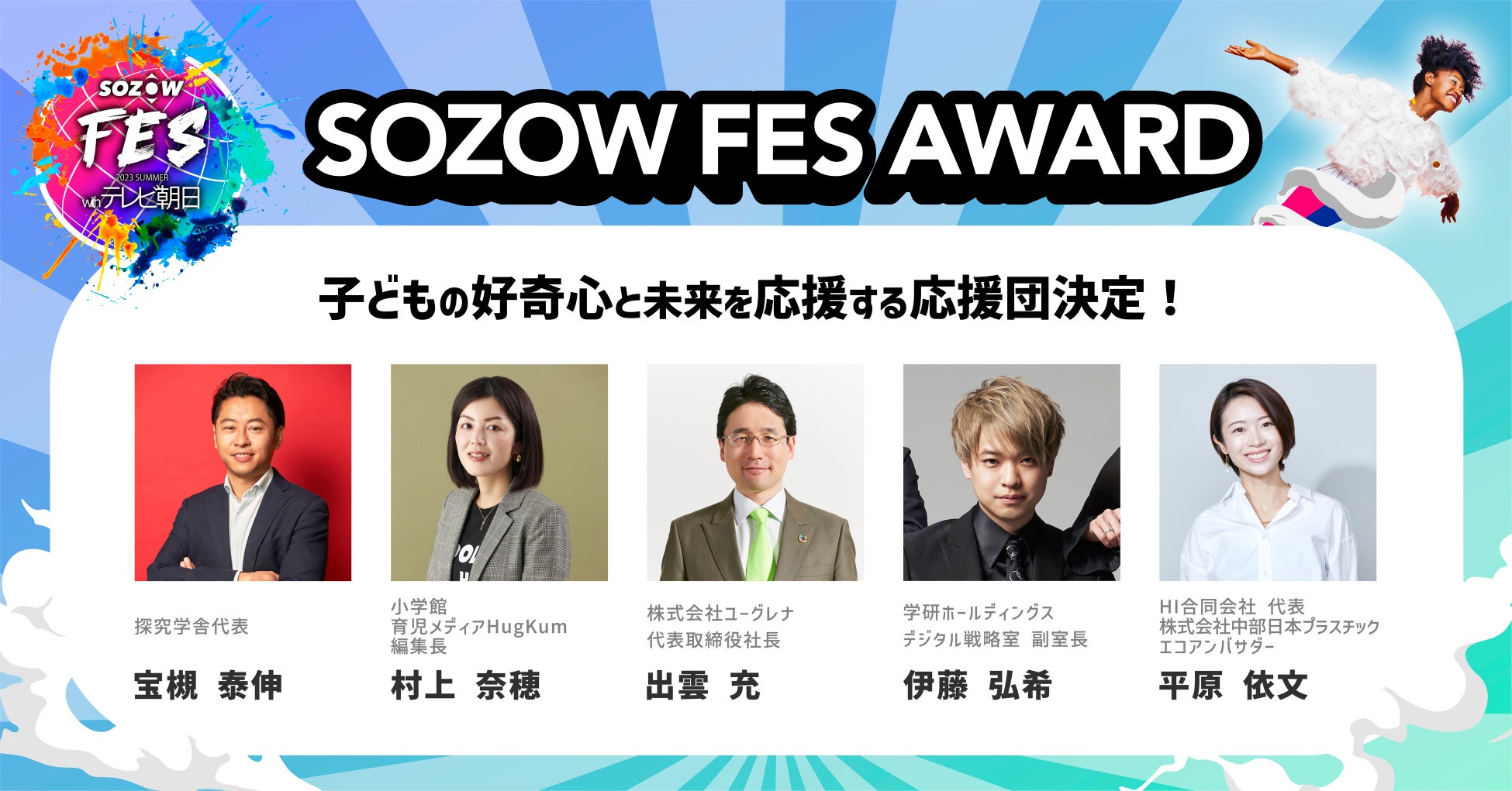 SOZOWは、子どもたちは「未来そのもの」であり、子どもの「好き、やりたい」という好奇心がこれからの社会を作ると考えています。これからの時代は「一方的に与えられる学び」「画一的な枠に押し込まれる生き方」を子どもに押し付けることなく、子どもたちには個性や好奇心を解放して興味のあることを夢中で探求し、無限に可能性を広げていってほしいと願っています。そのためには、大人が子どもの好きや夢中を否定しないことが重要になります。社会全体で、子どもの好奇心・未来を応援する文化を作り上げたい。その思いで、この夏開催する親子体験型オンラインフェス「SOZOW FES 2023 Summer with テレビ朝日」の中で子どもたちが主役のプレゼン大会「SOZOW FES AWARD」を8月5日(土)に実施いたします。