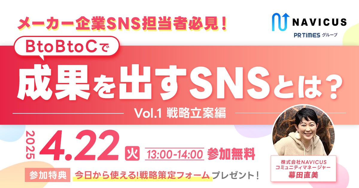 SNSを通じて企業様や地方自治体様のコミュニケーション支援サービスを提供する株式会社NAVICUS(本社:東京都千代田区、代表取締役:武内 一矢、以下:NAVICUS)は、2025年4月22日(火)に無料ウェビナー「メーカー企業SNS担当者必見!BtoBtoCで成果を出すSNSとは?〜Vol.1 戦略立案編〜」を開催いたします。