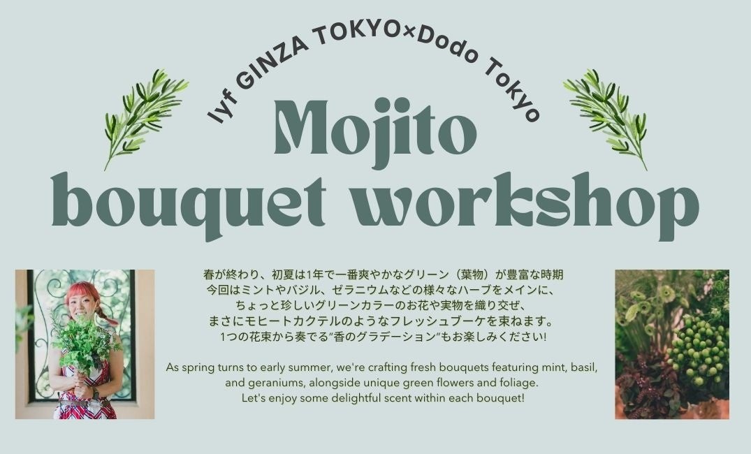 ただのフラワーアレンジメントではなく、今回はなんとモヒートに使う様々なハーブなどを束ねて、香りを楽しむ大人のワークショップ。生け花、ブーケ作り初心者の方でも1からお花の基礎をお伝えするので大丈夫!楽しみながらフラワーアレンジメントに挑戦してみよう!