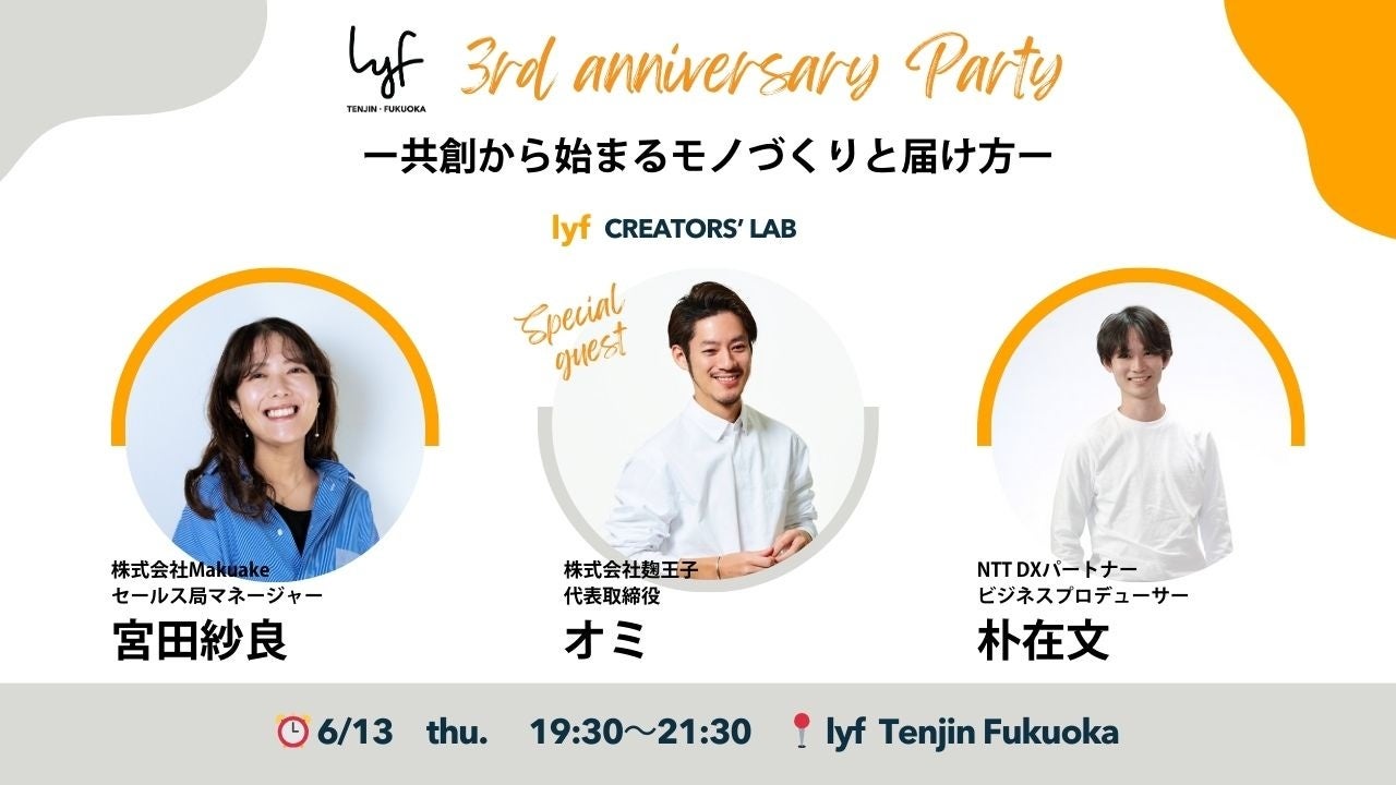 今回はlyf Japan日本上陸3周年を記念したお祝いパーティとして「共創から始まるモノづくりと届け方」をテーマにしたトークライブ&交流会。MakuakeのセールスマネージャーやNTTDXパートナーのビジネスプロデューサー、インフルエンサーの麴王子の名で有名なオミ氏をゲストに迎え、モノづくりやクラウドファンディングに挑戦してみたい方は必見の内容になっております。