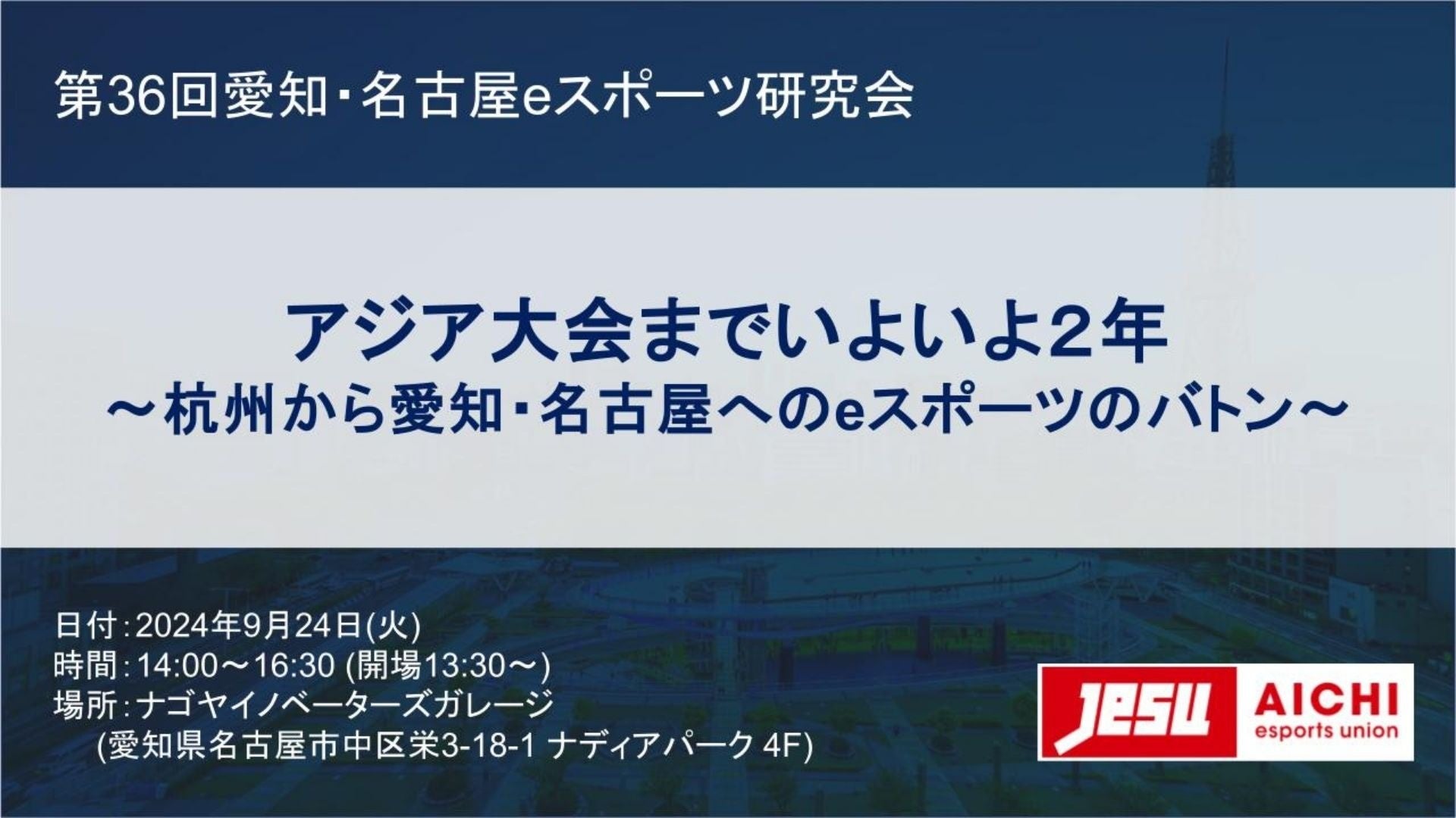 一般社団法人 愛知eスポーツ連合(JeSU愛知、所在地:愛知県名古屋市、代表:片桐正大)は2024年9月24日(火)、第36回愛知・名古屋eスポーツ研究会をナゴヤイノベーターズガレージ(所在地:愛知県名古屋市中区栄3-18-1 ナディアパーク 4F)にて開催いたします。
