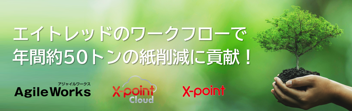 エイトレッドが開発・提供しているワークフローシステム「AgileWorks」「X-point」とワークフロークラウド「X-point Cloud」は社内のあらゆる申請書を電子化することが可能となっており、多くのユーザー様にご利用いただいた結果、年間で削減することができた紙の試算量は約50トンと推測されます。