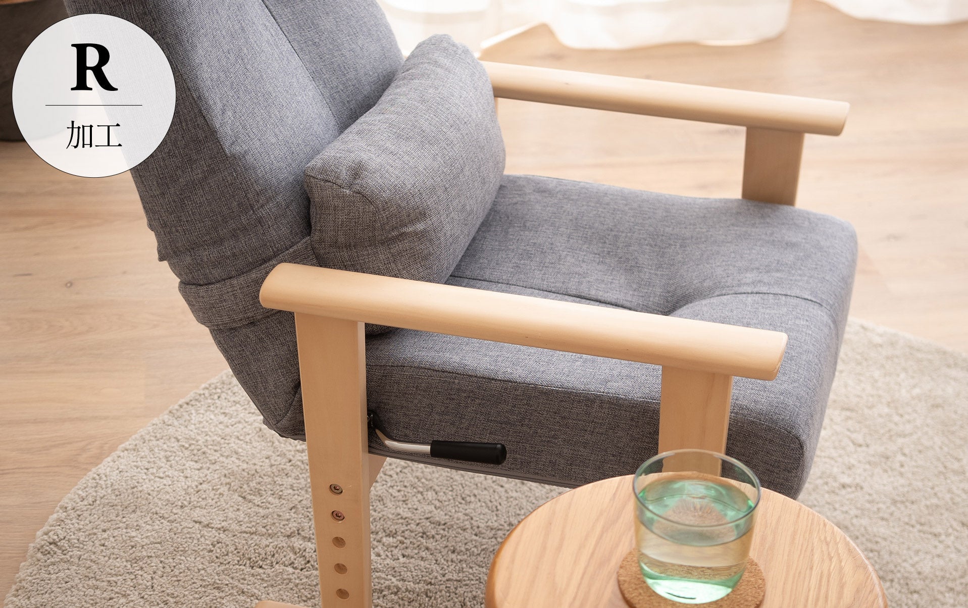 天然木を使用した肘掛けは自然に触れる部分に緩やかなカーブ(R加工)を施し、 なめらかな手ざわりと、握りやすさを実現しました。