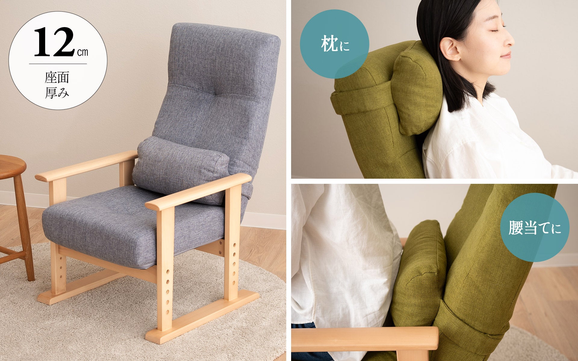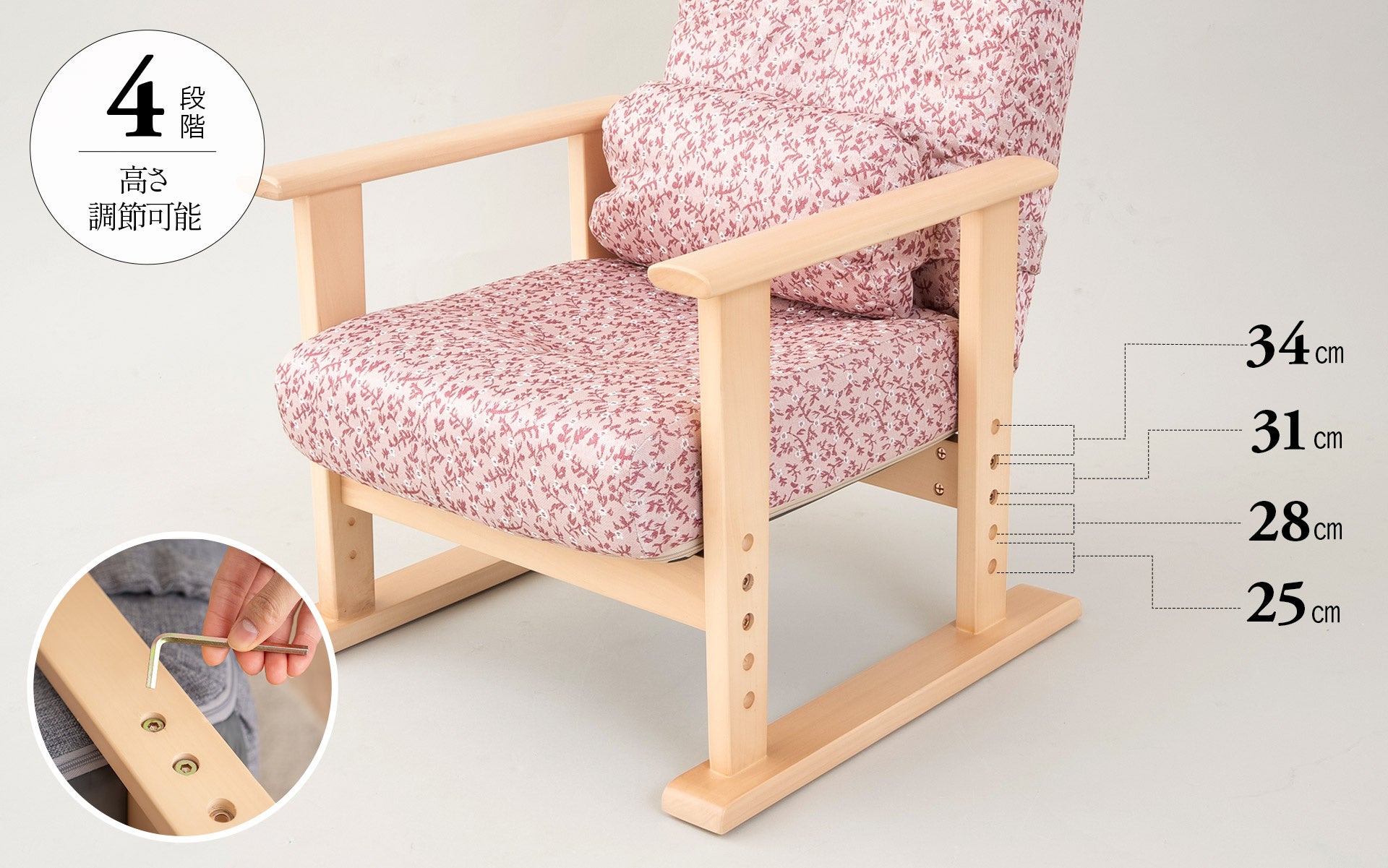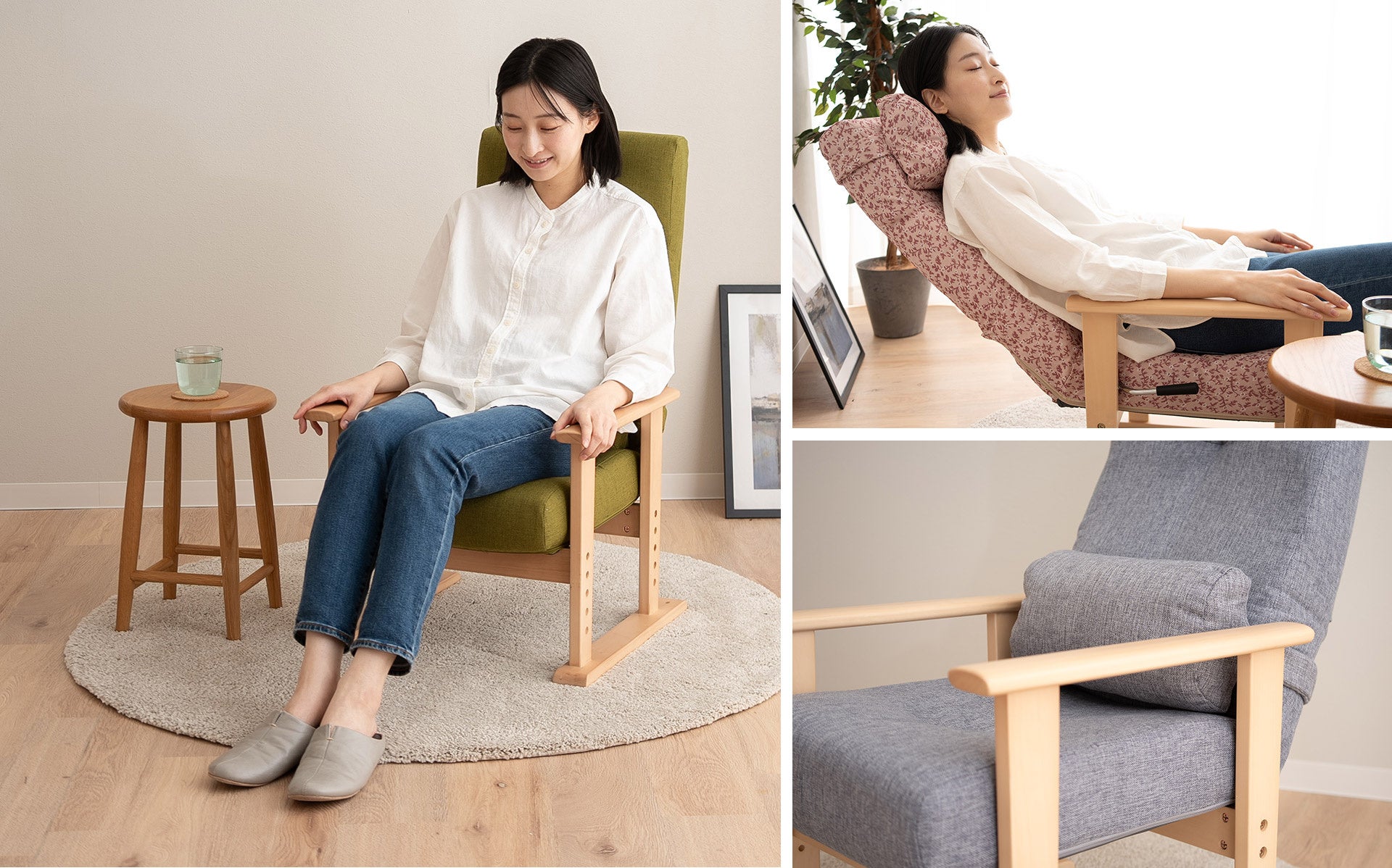 体型やライフスタイルに合わせて高さを調節することで、 立ち座りの負担を軽減。 さらにくつろぎやすく、快適にお過ごしいただけます。
