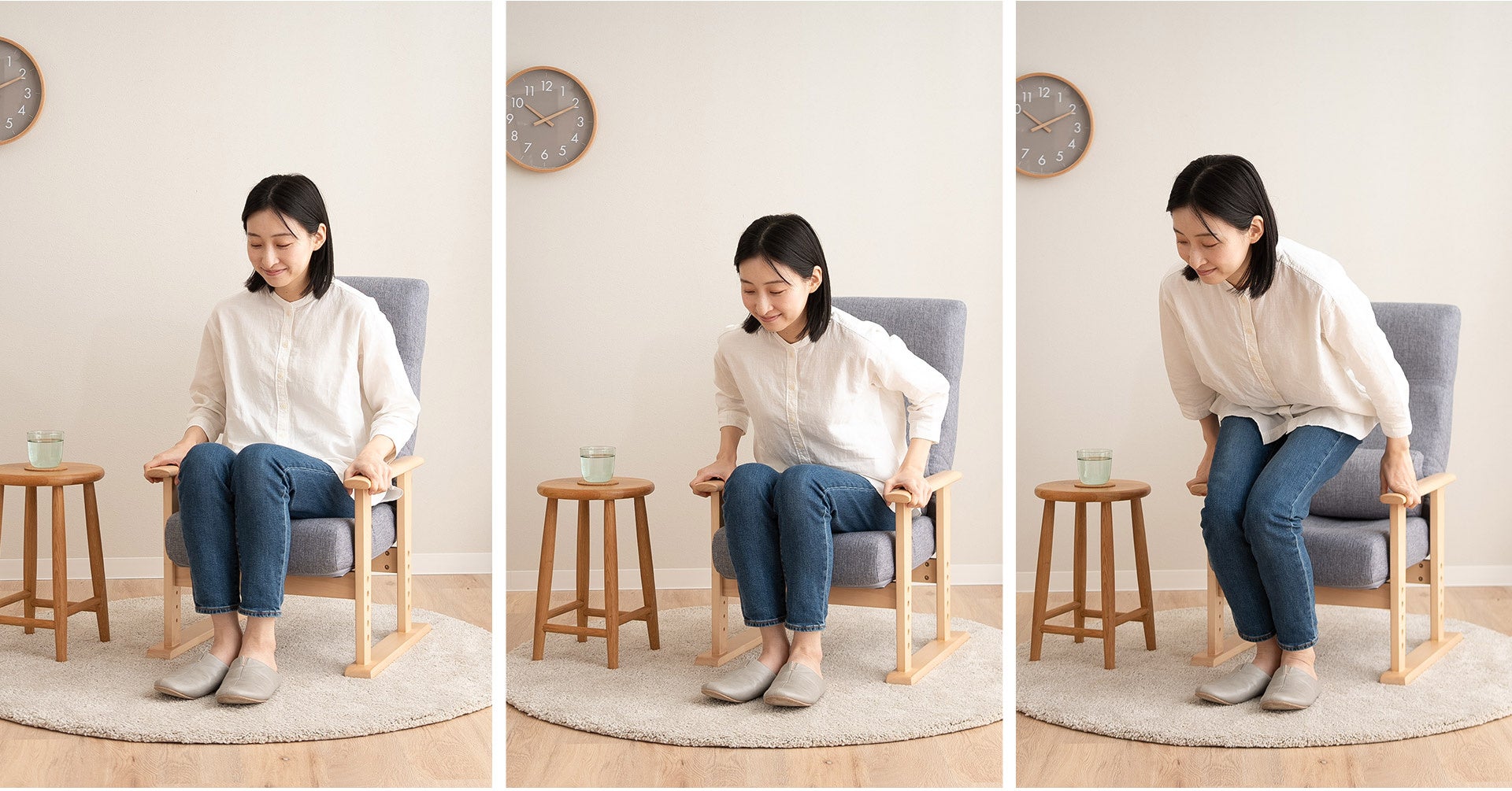 高座椅子を選ぶ際、座り心地はもちろんのこと、立ち上がり時のご負担を懸念される方が多くいます。立ち上がる負担が少なければ、立ち上がる頻度が増え、室内での行動量が増え、健康寿命の延伸につながっていきます。
