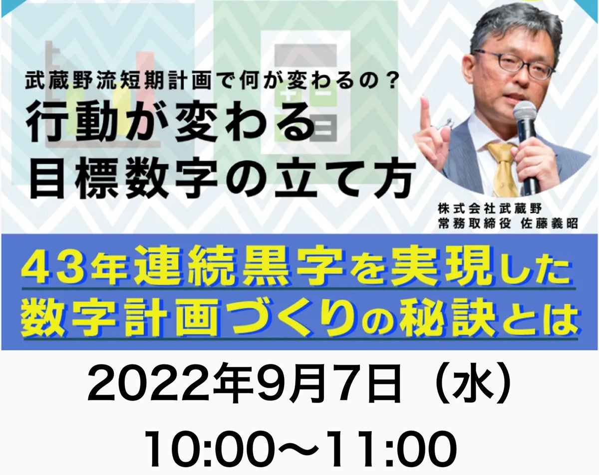 株式会社武蔵野(東京都、小金井市、代表取締役社長:小山昇)は、昨年好評だった、経営者向け無料オンラインセミナー「行動が変わる目標数字の立て方」を2022年9月7日(水)10:00から無料公開します。社員の行動を変えて、業績を向上させた株式会社武蔵野の実体験をお時間許す限り公開いたします!“5年で売上を2倍にする”武蔵野流経営戦略とは、一体どんな戦略なのか。自社だけでなく、指導する会員企業750社のうち400社以上が過去最高益を達成する武蔵野流の経営方針についてお話します。