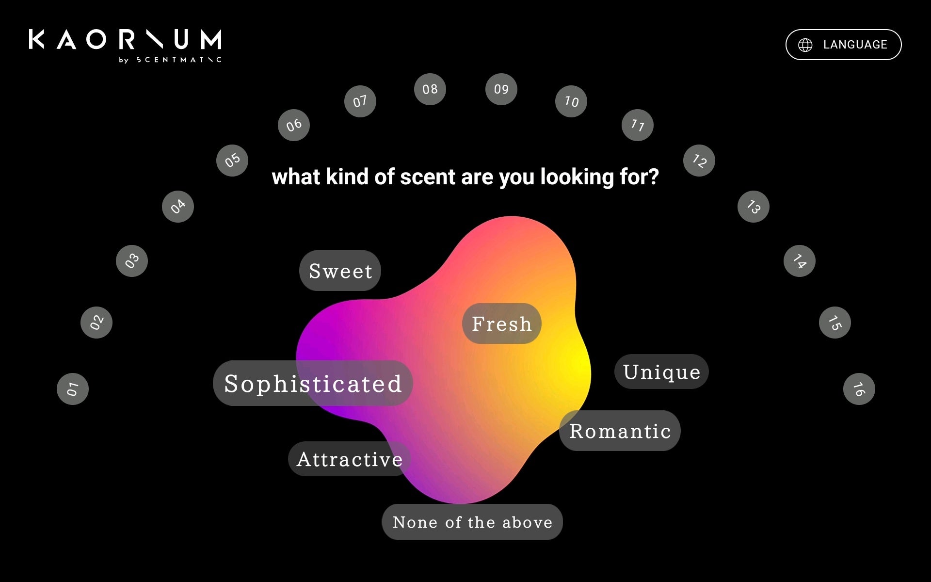 また今回のPOPUPイベントでは多言語対応のKAORIUMを設置いたします。デバイス左上に表示される「Language」ボタンから日本語と英語を切り替えて利用することができます。これにより、店舗を訪れた訪日外国人旅行客はじめとした外国人の方にもAIによる香り選びを体験いただくことが可能になりました。