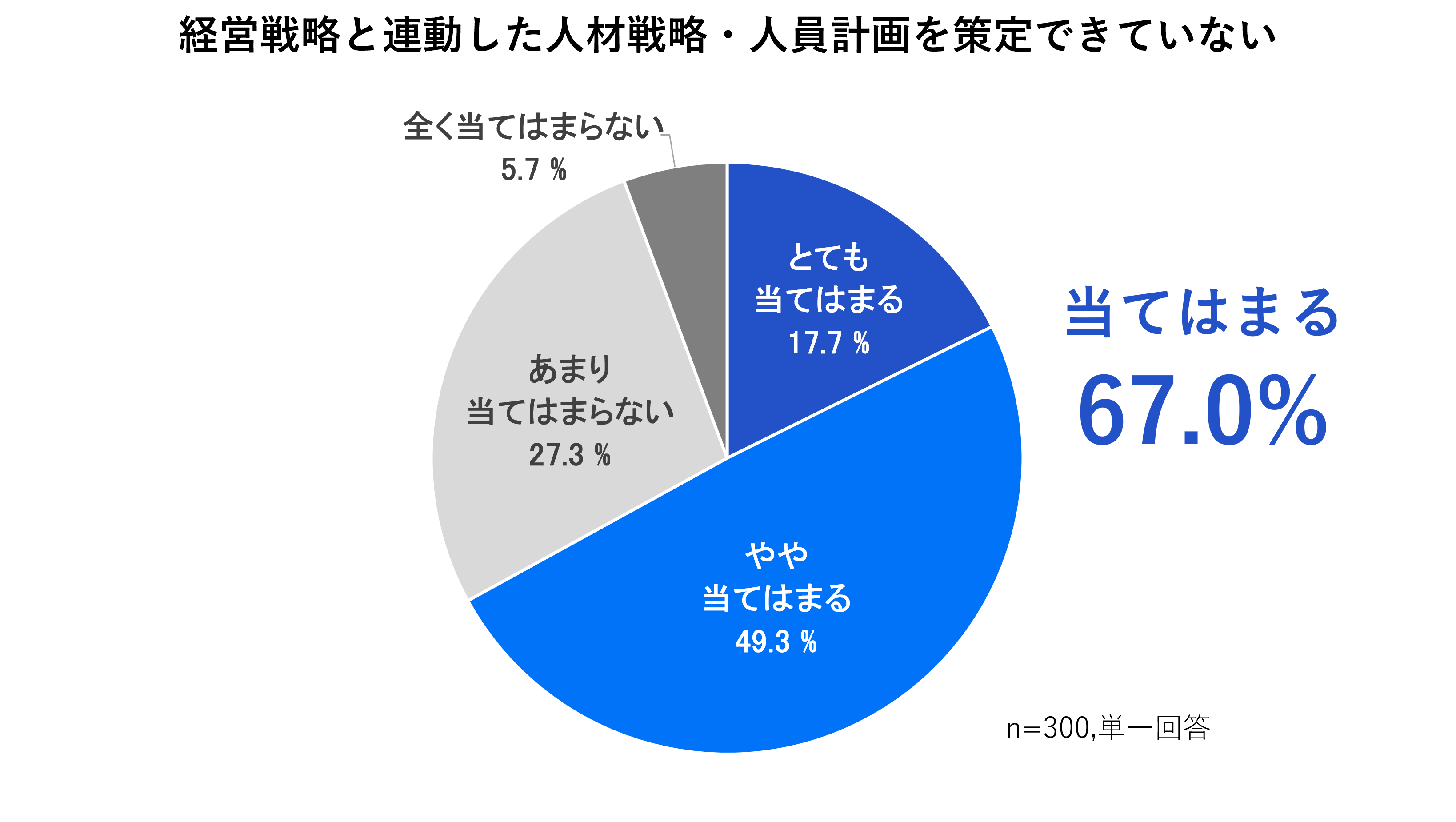 当社が企業の経営企画担当者300名を対象に実施した調査によると、経営戦略と連動した人材戦略・人員計画を策定できていない企業は、全体の7割に上り、日本企業にとって大きな課題となっています。