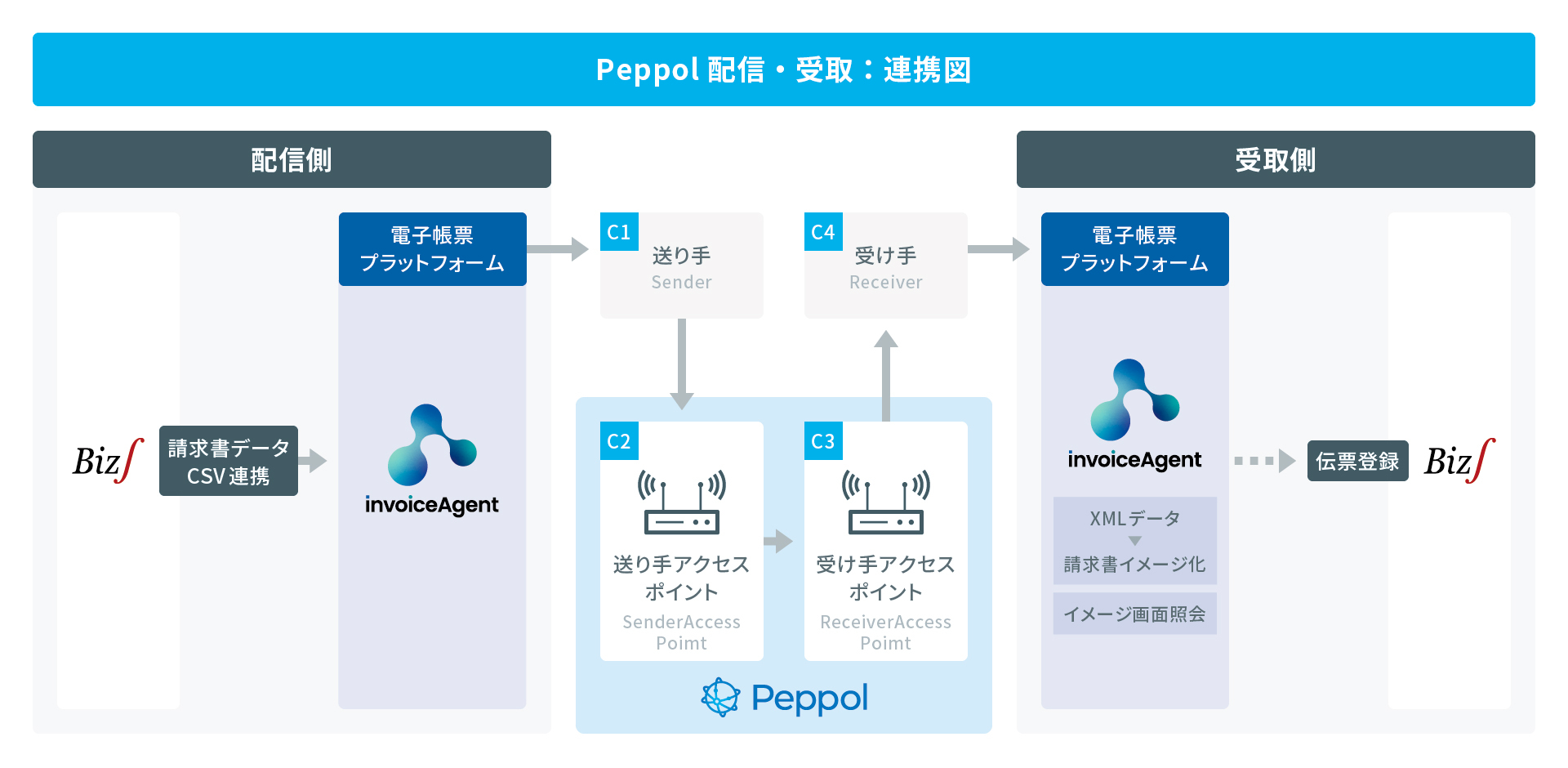 配信(請求)企業側では「Biz∫」で作成された請求データを「invoiceAgent」に連携し、Peppolネットワーク経由で受取先に配信を行うことができます。一方、受取(被請求)企業側では受信したPeppolデータ(xmlフォーマット)が請求書フォーマットに変換され、請求データの照会が可能になります。
