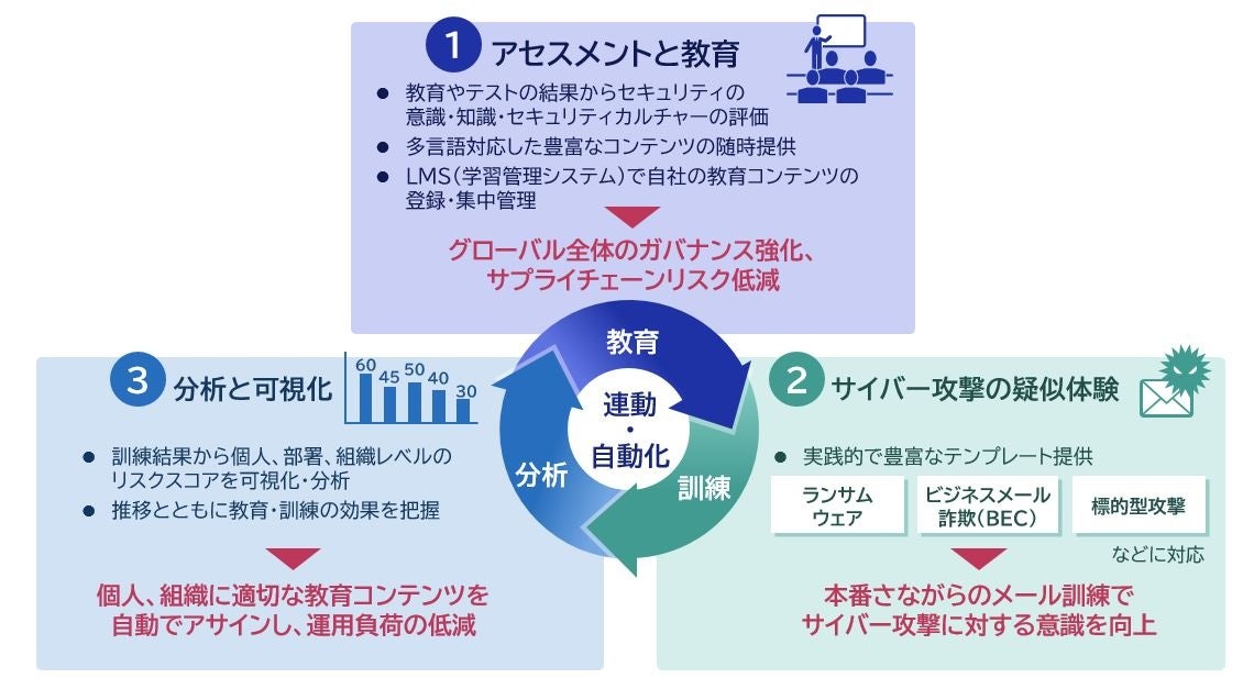 本サービスは、繰り返し実施できるメール訓練と豊富な教育コンテンツにより、組織内のセキュリティアウェアネス(セキュリティ意識)を向上させ、フィッシング(詐欺)メールをはじめとしたセキュリティリスクへの対応力を強化します。また、多言語対応した教育コンテンツを海外拠点や関連会社も含めて広く展開することで、グローバル全体でのガバナンス強化、サプライチェーンリスク低減が可能です。さらに、見えにくいセキュリティ教育の効果を訓練結果から分析し可視化します。組織内の部門や個人単位でリスクも把握でき、リスクが高いと判断された対象に追加でメール訓練や教育の受講を実施するなど効率的に運用することができます。
