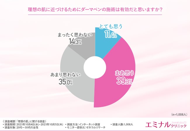 「理想の肌に近づけるためにダーマペンの施術は有効だと思いますか?」と質問したところ、『とても思う(11.4%)』『まあ思う(39.3%)』『あまり思わない(35.0%)』『まったく思わない(14.3%)』という回答結果になりました。
