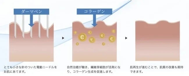 ダーマペンは髪の毛よりもさらに細い超極細針を使用し、肌の表面に小さな穴を作り、肌の自然治癒力の働きにより、美肌に導く肌再生治療です。