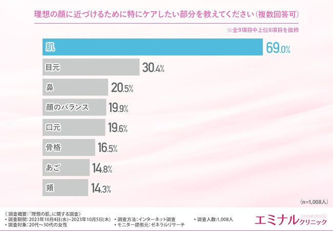 「理想の顔に近づけるために特にケアしたい部分を教えてください(複数回答可)」と質問したところ、『肌(69.0%)』と回答した方が最も多く、次いで『目元(30.4%)』『鼻(20.5%)』『顔のバランス(19.9%)』『口元(19.6%)』と続きました。
