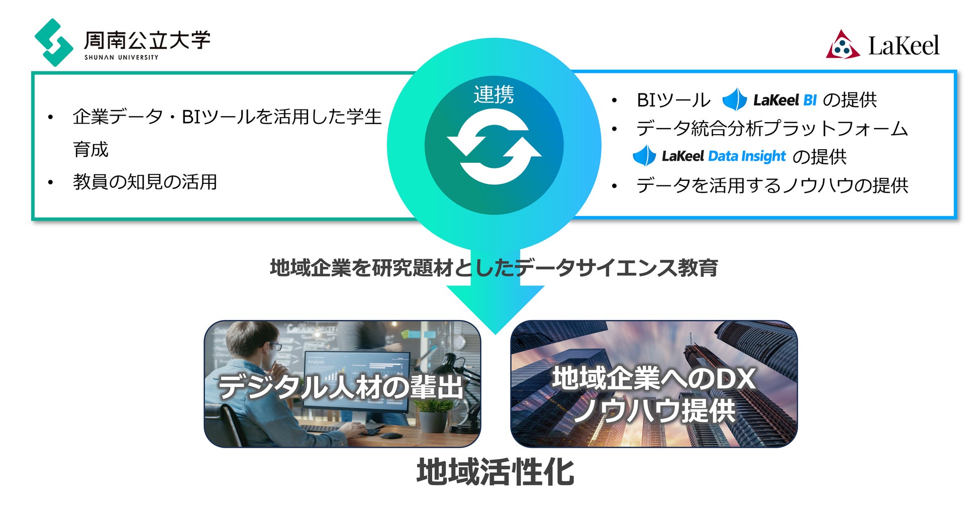周南公立大学は地域産業を支える情報科学のエキスパートを輩出することを目的とし2024年4月に情報科学部を新設します。ラキールはその想いに賛同し、ビッグデータの収集・加工・可視化の技術やAIを活用した高度な分析によるデータドリブン経営などについてノウハウを提供します。また、ラキールのデータ統合分析プラットフォーム「LaKeel Data Insight」とビジネスインテリジェンスツール「LaKeel BI」を授業で活用いただけるよう無償で提供します。授業では地域企業のデータを活用し、地方企業のDXを推進していくために重要な知識を実践型で研究できる環境を提供する予定です。