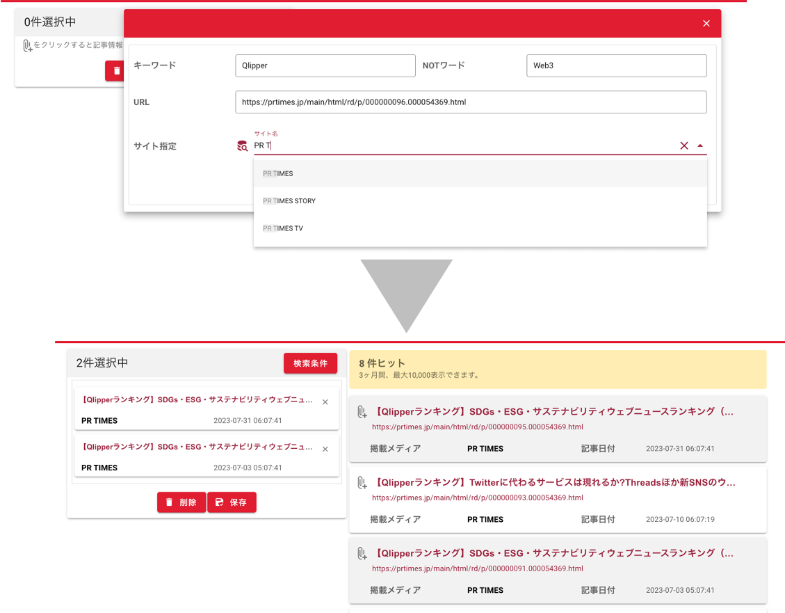 また、クリッピングで保存した記事はモニタリングの結果に合流させることができます。