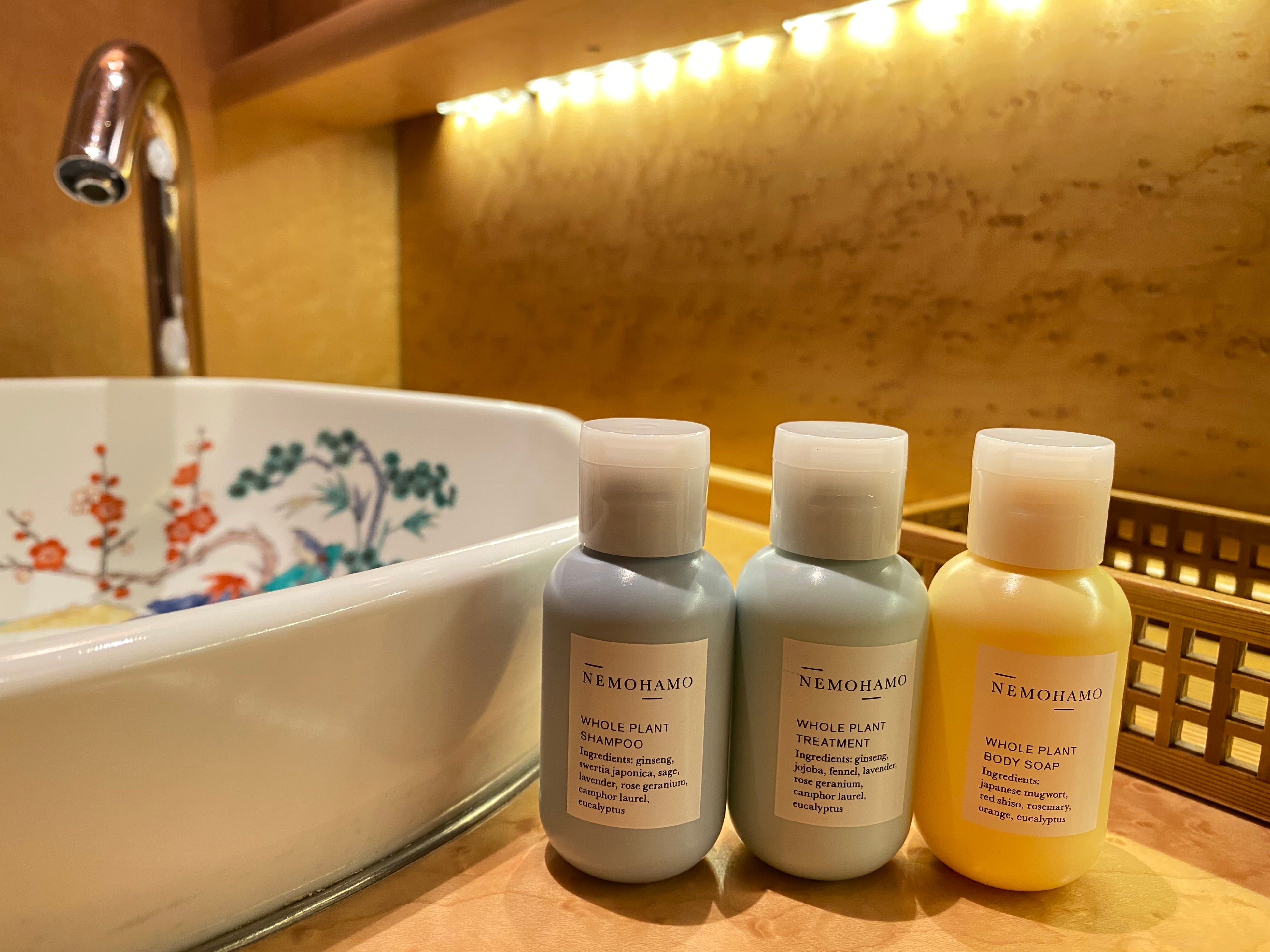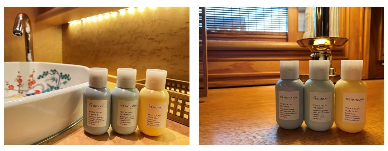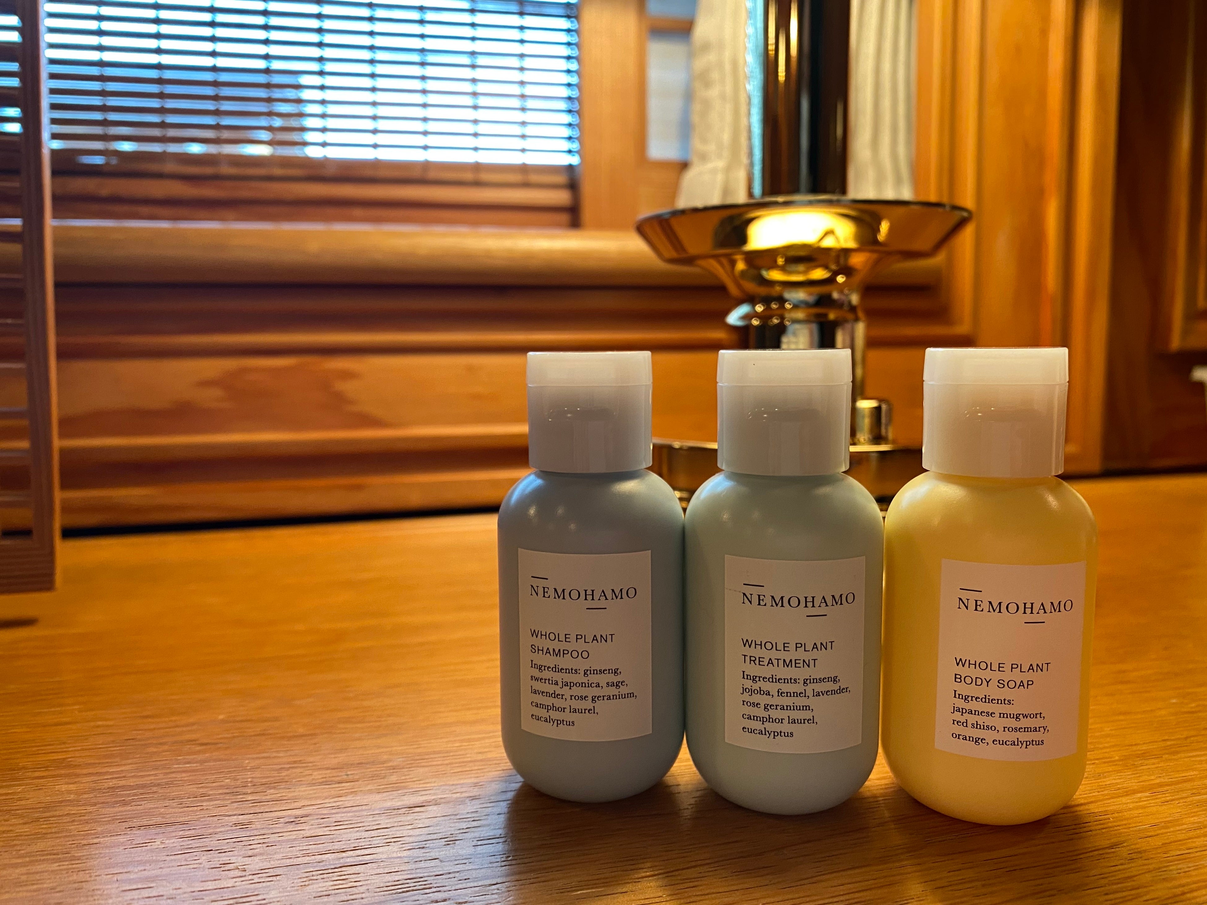 提供されるのは、オタネニンジンをキープラントとした植物まるごとのエキスを配合し、NEMOHAMO でも人気の和ハーブ配合シャンプーとトリートメント、植物由来の保湿成分で心安らぐ洗い心地のボディソープの3種。各30mlのミニボトルセットが、スイートルームのアメニティセットに加えられます。環境への負荷を軽減する取り組みとして、ボトル本体にはバイオマスPE 50%を採用し、本体とキャップにはグリーンナノ※1 を配合しています。