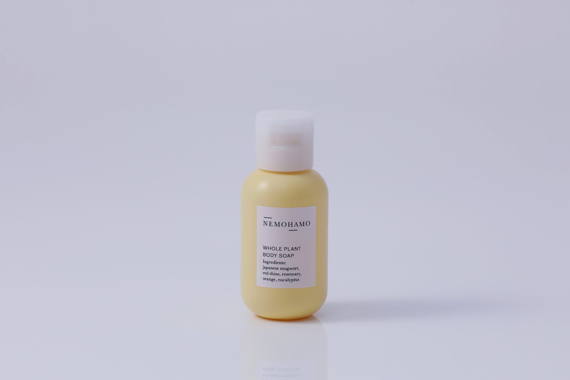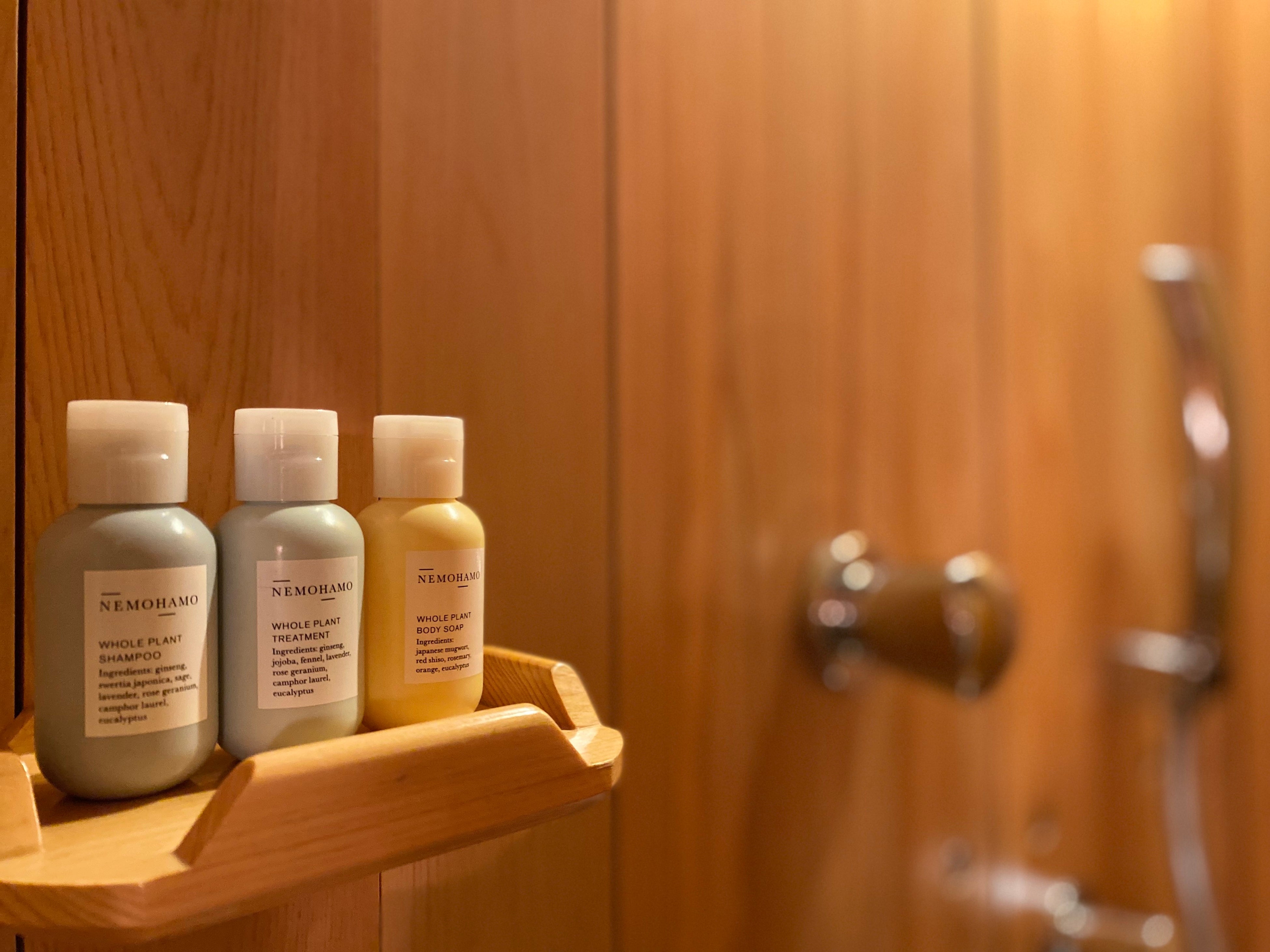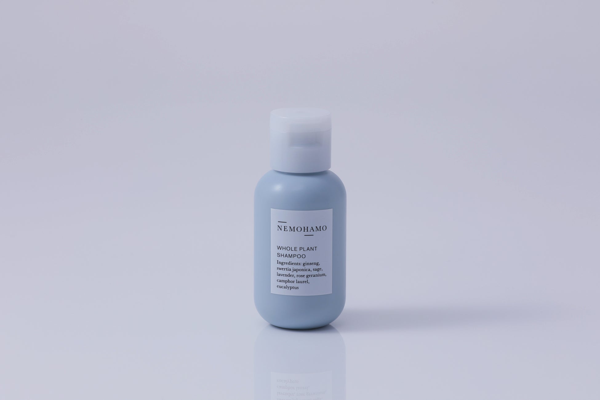 提供されるのは、オタネニンジンをキープラントとした植物まるごとのエキスを配合し、NEMOHAMO でも人気の和ハーブ配合シャンプーとトリートメント、植物由来の保湿成分で心安らぐ洗い心地のボディソープの3種。各30mlのミニボトルセットが、スイートルームのアメニティセットに加えられます。環境への負荷を軽減する取り組みとして、ボトル本体にはバイオマスPE 50%を採用し、本体とキャップにはグリーンナノ※1 を配合しています。