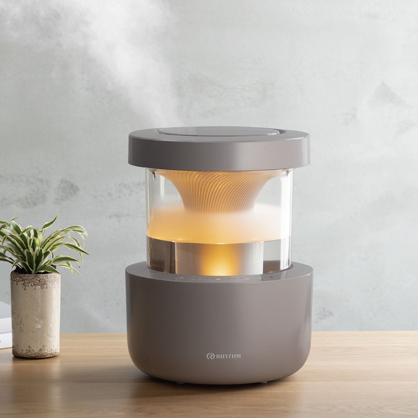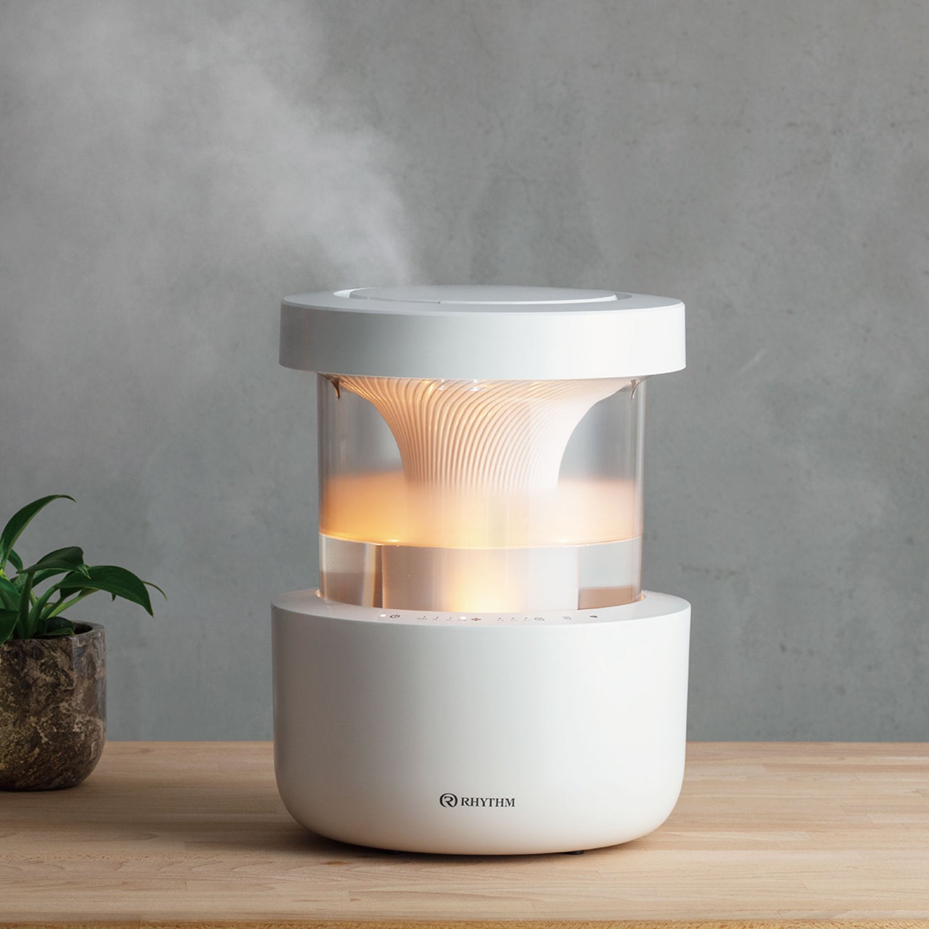 リズムのMIST 300の適用畳数を10畳に拡大し、「タンク乾燥機能」を追加。洗いやすさをさらに追求しました。カラーリングはライトグレーに新色「ウォームグレー」が加わりました。乾燥する季節に快適な湿度とくつろぎの時間を提供する超音波式プールレス加湿器です。毎日「新鮮で綺麗な水」で加湿できるように、洗いやすさ、使いやすさを一から見直しました。 「水」が「霧」になり「湿度」に変化する一連の流れをあかりとともに演出し、パブリック空間を清潔に加湿する「MIST 350」でくつろぎの時間をお楽しみください。