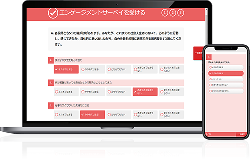 PC、スマートフォンから5分ほどで回答可能。(1)自身のエンゲージメント状態、(2)活用できる組織資源、(3)仕事との相性に加え、(4)エンゲージメントを高める個人特性=ジョブ・クラフティングの傾向が測定される。