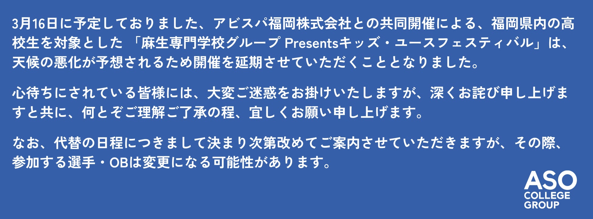 麻生専門学校グループは、今津運動公園にて、アビスパ福岡株式会社との共同開催により、福岡県内の高校生を対象とした 「麻生専門学校グループ Presentsキッズ・ユースフェスティバル」 を開催いたします。