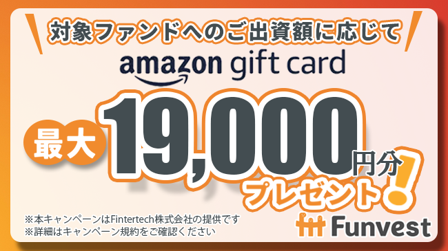 また、本ファンドへの出資額に応じて最大19,000円分のAmazonギフトカードをプレゼントするキャンペーンを併せて実施いたします。