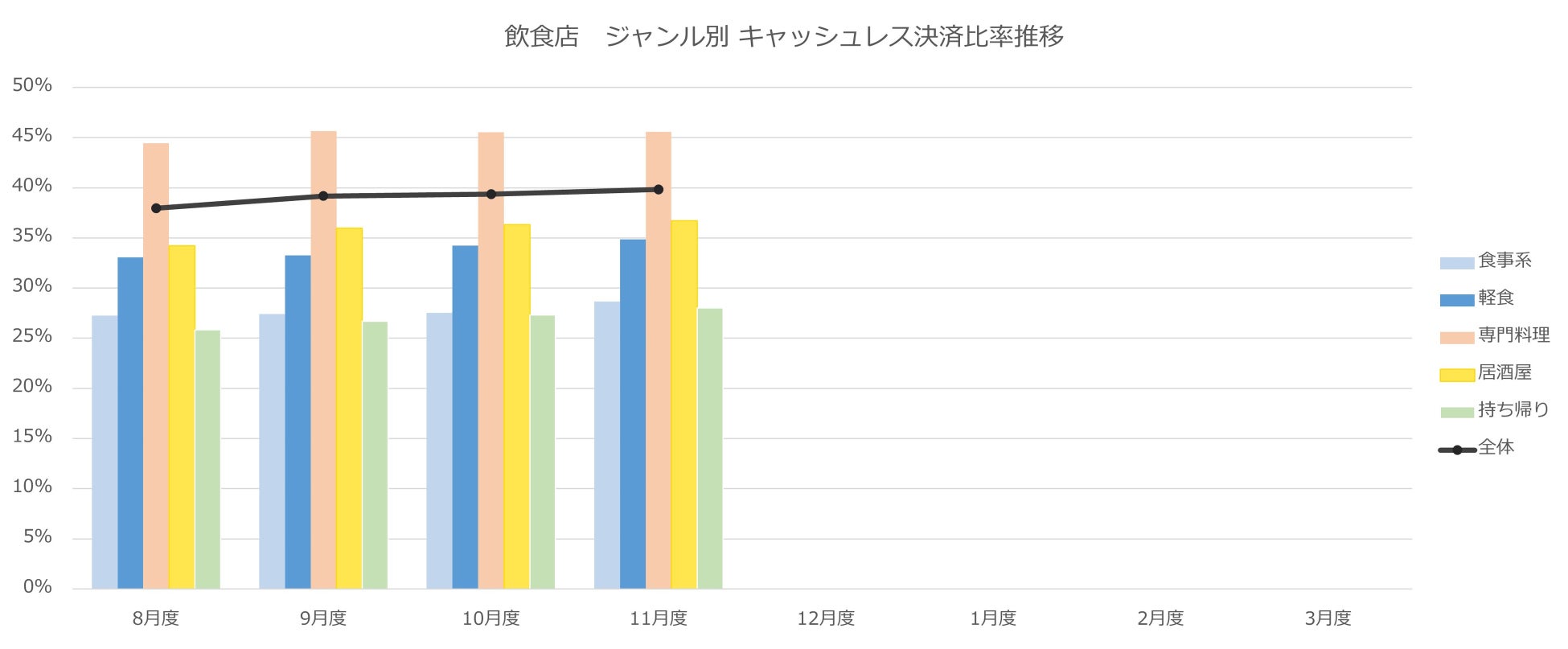 10月度→11月度で飲食店全ジャンルのキャッシュレス決済比率は101% (39.4%→39.8%)。軽食では102%、食事系では104.3%と、前月から比較的伸びている。