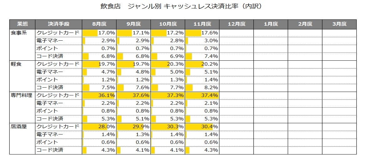 ・10月度→11月度比較すると、クレジットカード比率はどの業態も横ばいだが、コード決済比率は伸長している。特にコード決済比率の高い食事系と軽食で前月から+0.5ptと伸びが大きい。