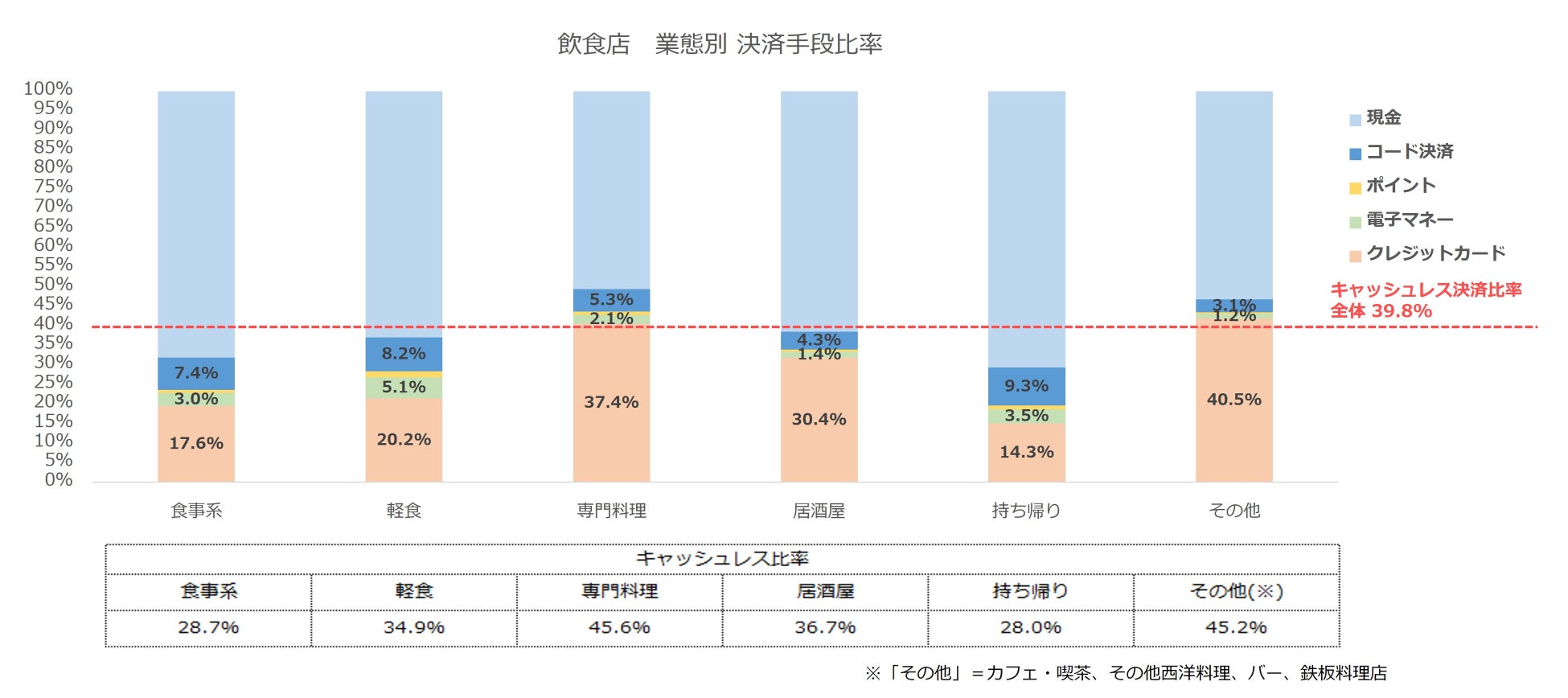 ・業態別のキャッシュレス比率では、専門料理の45.6%、その他で45.2%を占めている。持ち帰り系ではコード決済比率が9.3%と高いが、現金決済が72%を占める。