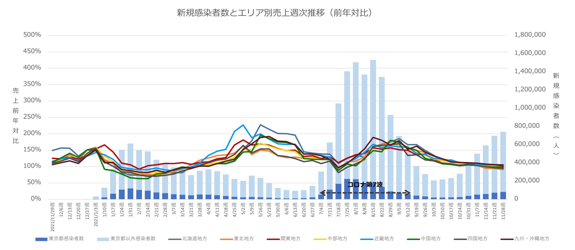 ・売上の前年対比はいまだ100%以上を保持しているが、引き続き右肩下がりの傾向を示している。感染者数は第7波を超えるような感染者数ではないものの、12月に入り増加傾向になっている。