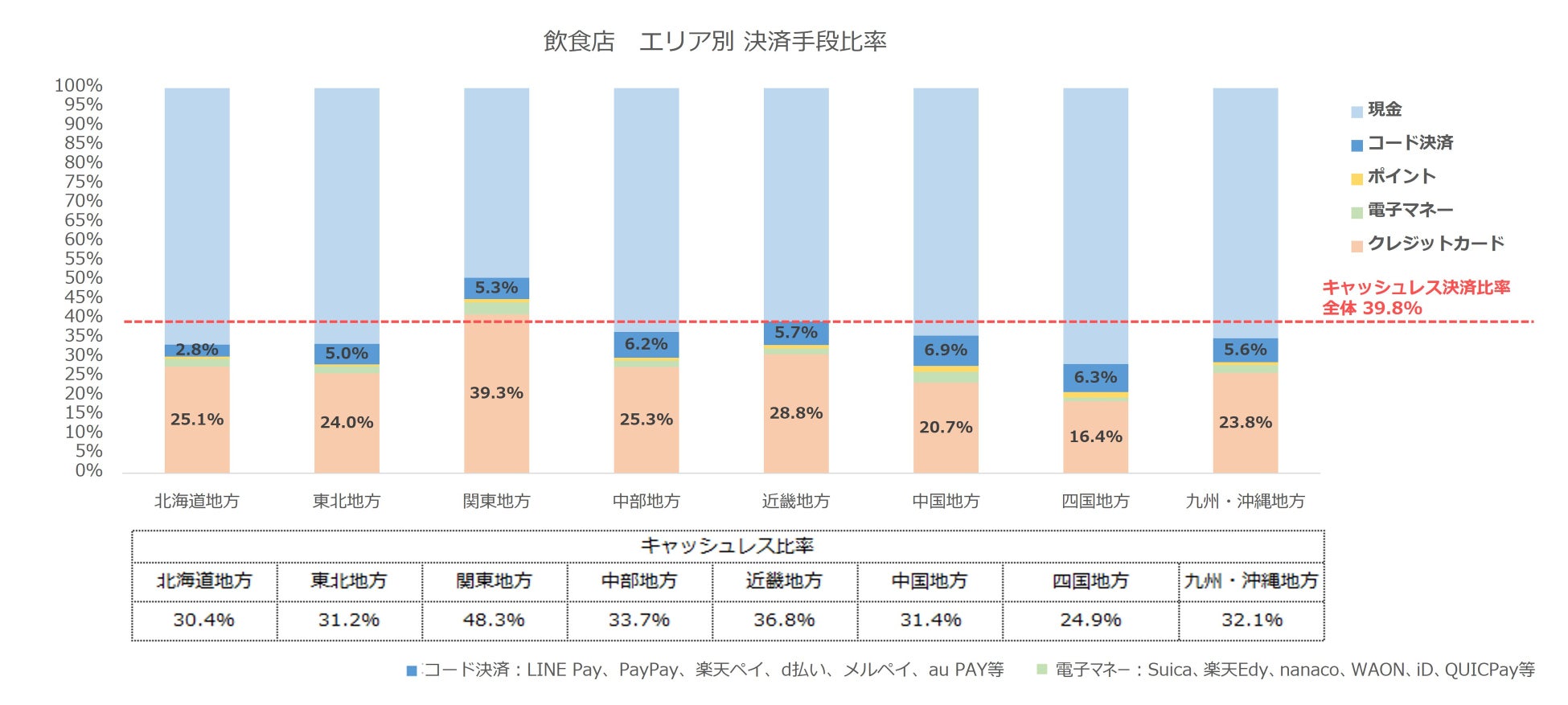 キャッシュレス決済比率は全国で39.8%。前月が39.4%だったためほぼ横ばい。キャッシュレス決済比率が最も高い関東地方はクレジットカード決済が39.3%を占める。