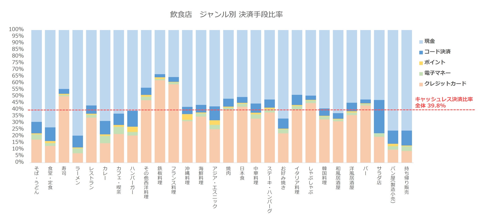 集計内容:飲食店 ジャンル別 キャッシュレス決済方法比率、キャッシュレス決済比率(内訳)