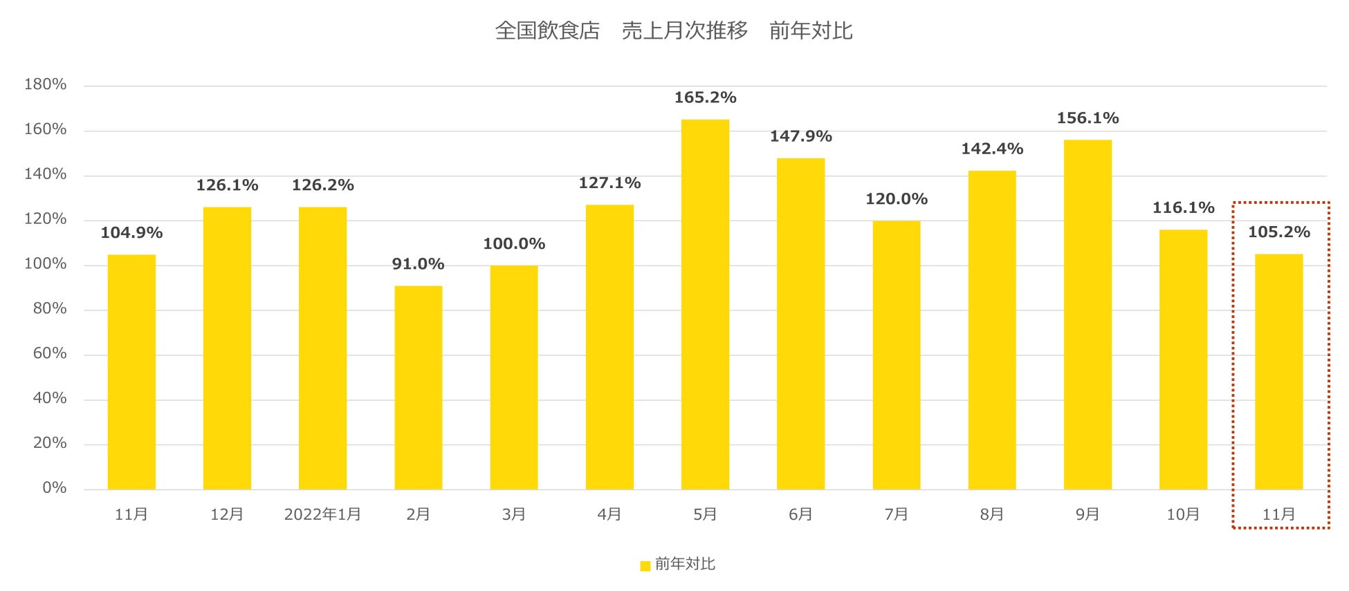 11月度の前年対比の売り上げ伸長率は、前月から-10.9ポイント減少し前年対比で105.2%となった。