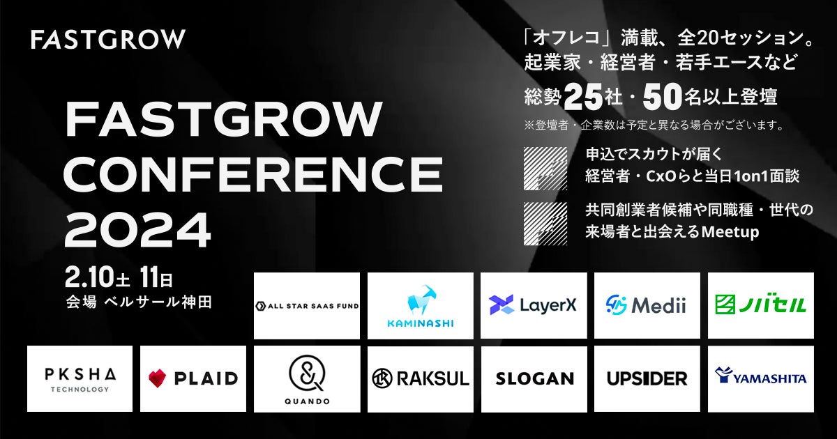 「FastGrow Conference 2024」は、挑戦を続ける若手経営人材に「学びの場」を提供するための大型オフラインイベントです。現在様々なベンチャー企業で活躍されている総勢 50 名以上の起業家、経営者の方々が登壇し、実践している経営のスキルや思考法など、ビジネスノウハウが詰まったセッションを「オフレコ」有りで行います。