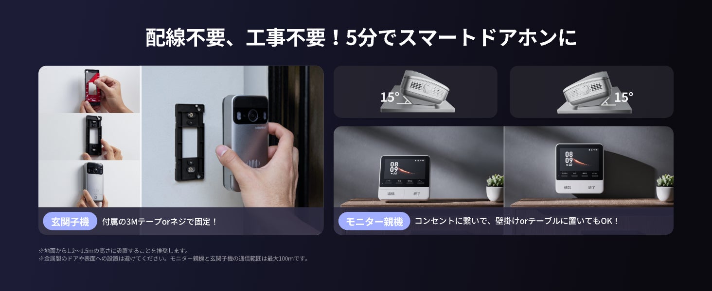 カメラ付き子機を玄関先に「貼るだけ」というたった5分の動作で、自宅のインターホンがスマートドアホンに大変身!ネジで固定してももちろんOK。モニター親機はスタンド付きで、家族みんなが頻繁に通りかかるリビングのテーブル上など、いわば「おうちのヒートマップ」に立てて置くことも、玄関に壁掛けで設置することも可能です。