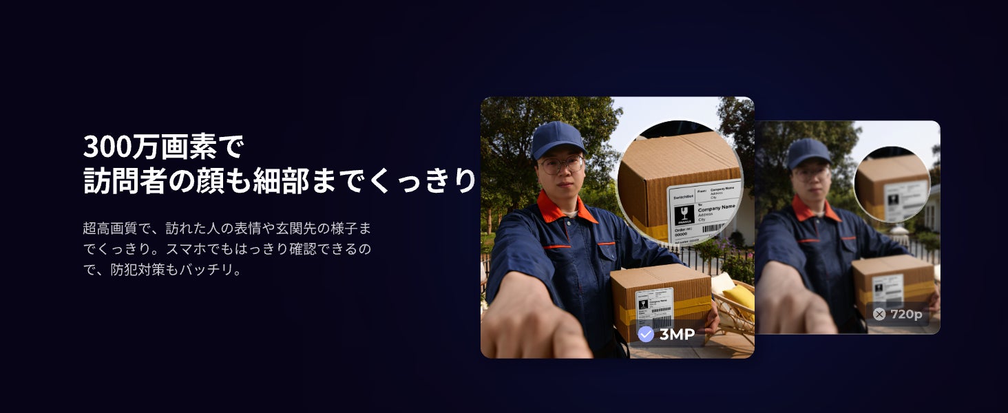 300万画素の高画質にフルカラーナイトビジョン、そして訪問者の顔からつま先、死角になりやすいドア横の影までハッキリ映す165°の超広角レンズも搭載。昼夜を問わず、いつ何時でも、何人が訪れようとも、玄関先で起こり得るすべてを、超鮮明に映し、記録します。