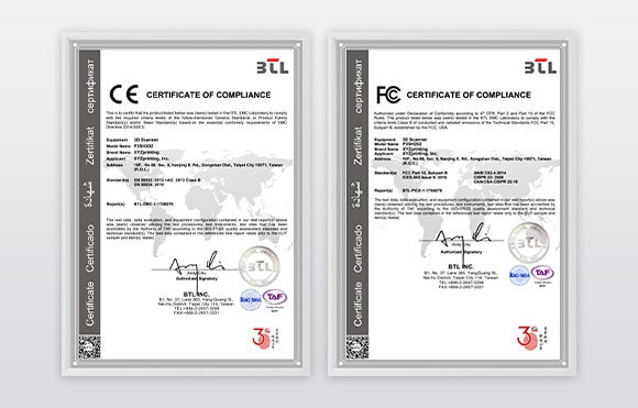 「XYZscan Handy+」は支援者の皆様に安全・安心して本製品をご使用いただけるよう、製品安全におけるCEとFCCの認証を取得しました。