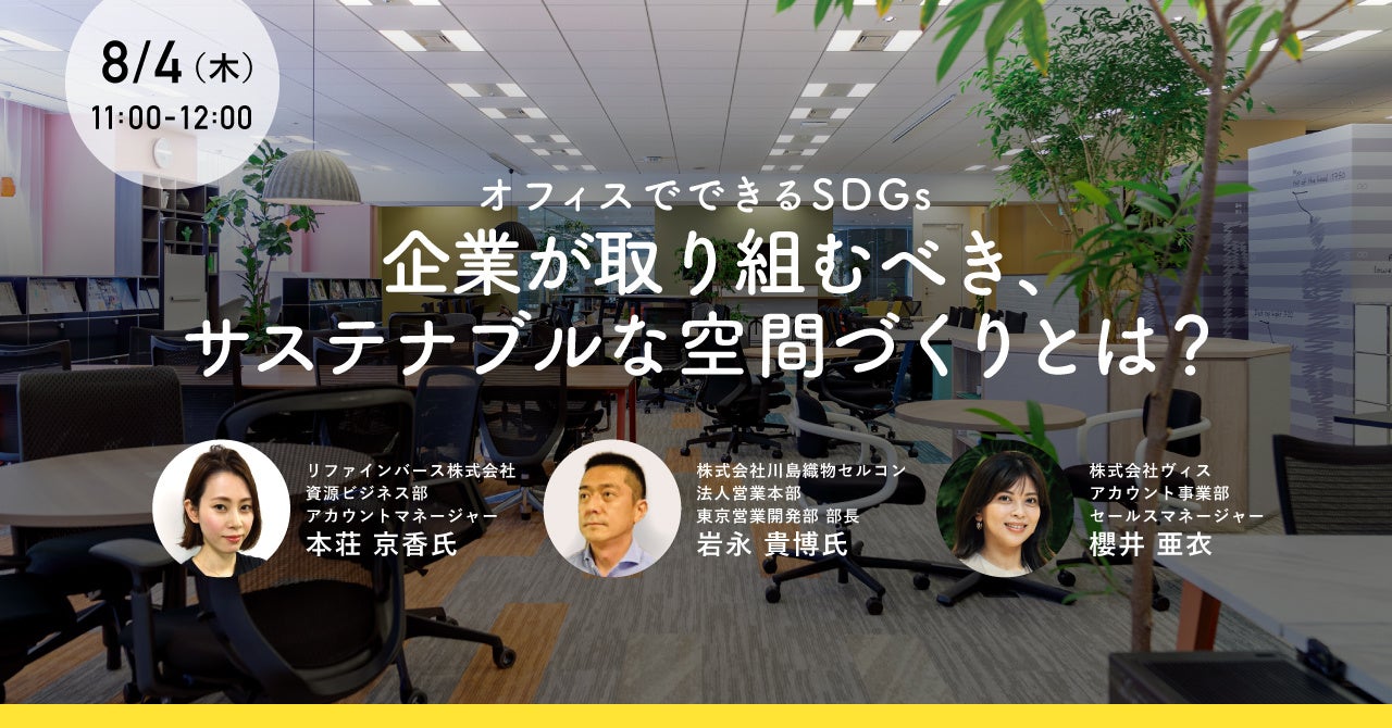 デザイナーズオフィスを手がけ、「はたらく」をデザインする株式会社ヴィス(本社:大阪市北区、代表取締役社長:金谷智浩)は、2022年8月4日(木)に、無料オンラインセミナー「オフィスでできるSDGs ー企業が取り組むべき、サステナブルな空間づくりとは?ー」を株式会社川島織物セルコン、リファインバース株式会社と共催で開催することをお知らせします。