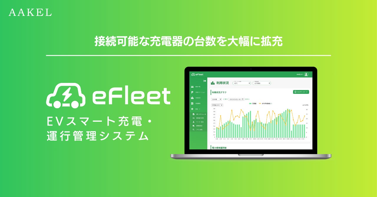 デジタルイノベーションで脱炭素化社会を実現するアークエルテクノロジーズ株式会社(本社:福岡県福岡市、代表取締役:宮脇良二、以下「アークエル」)は、EVスマート充電・運行管理システムAAKEL eFleet(以下「eFleet」)において、システム全体で接続可能な充電器の台数を大幅に拡充したことをお知らせします。