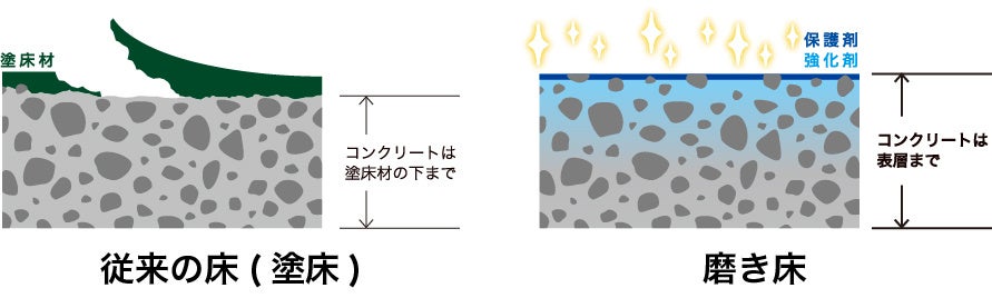 コンクリート床面を磨き上げてつくる床。素地の上に塗料を重ねる塗床と異なり、コンクリート素地がそのまま床面となるため、床の剥がれが起きにくい頑丈な床になります。施工の過程で使用する無機系薬剤の効果によって汚れが付きにくくなるほか、鏡面のような光沢をもつ美しい床になることも特徴です。既設の床にも施工が可能です。