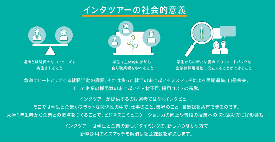 「インタツアー」は選考ではない新しいタイミングから新しいつながり方を提供し、ミスマッチの解消を通して社会の課題を解決します。