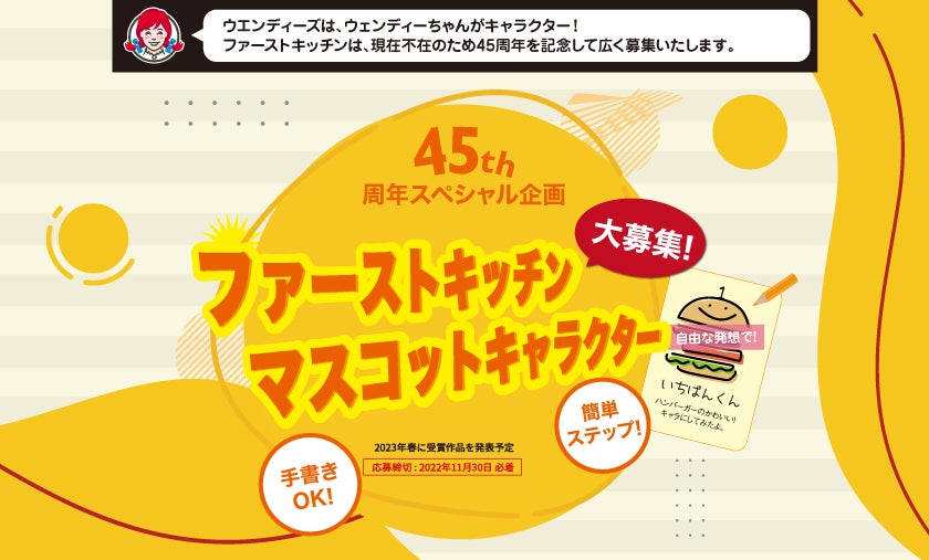 ファーストキッチンにはこれまで、公式マスコットキャラクターがいませんでしたが、45周年を記念して、ウェンディーズ・ファーストキッチンのウェンディ―ちゃんのように、皆さまに愛される公式マスコットキャラクターを一般公募します。応募資格は、ファーストキッチンを愛している全ての方で、従業員も対象です。ホームページの45th Anniversaryページにある応募フォームから受け付けます。大賞作品は2023年春に発表する予定で、大賞受賞者には副賞として10万円を贈ります。また、佳作3名様には5万円を、応募者の中から抽選で50名様にバーガー無料券1枚をお渡しします。